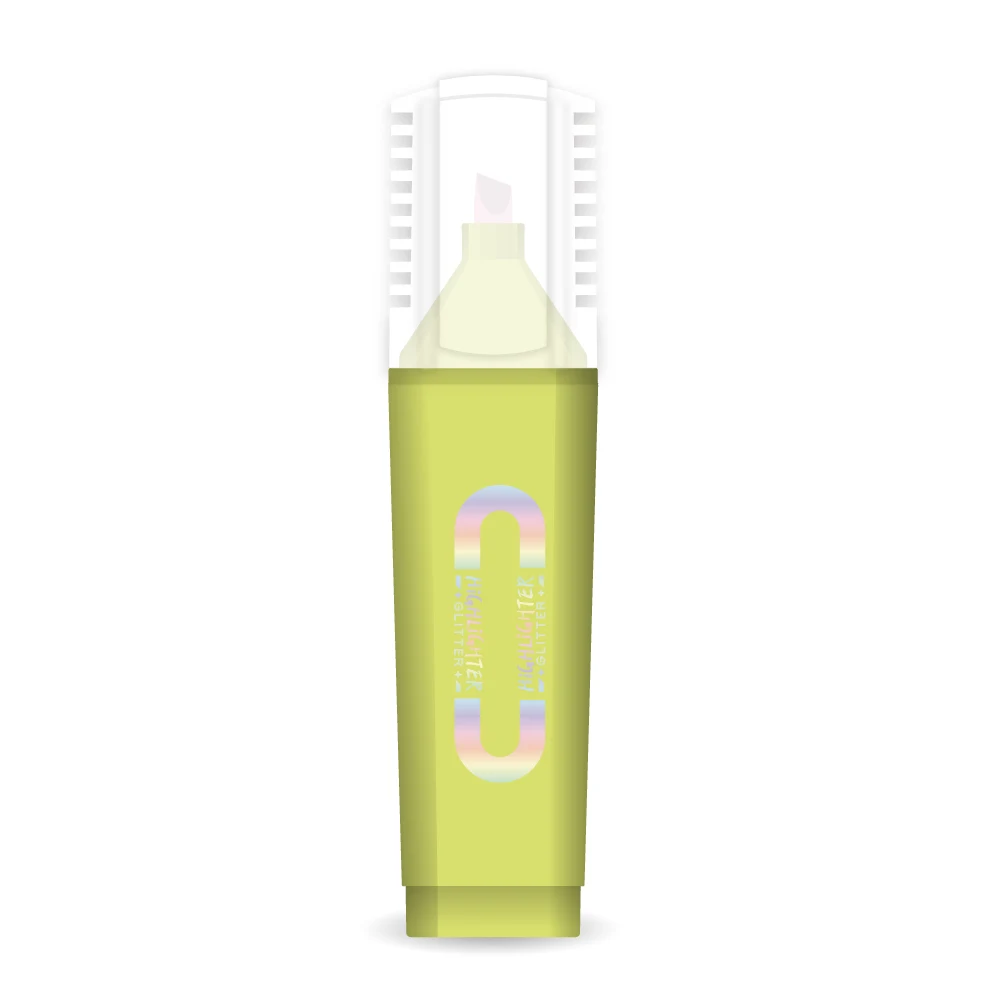 Kaito glitter highlighter, neon green, combines a crisp chisel tip with a compact plastic body. Holographic branding and a clear vented cap create a fresh, modern look. The glitter effect and vibrant tone make notes pop while fitting premium stationery assortments.