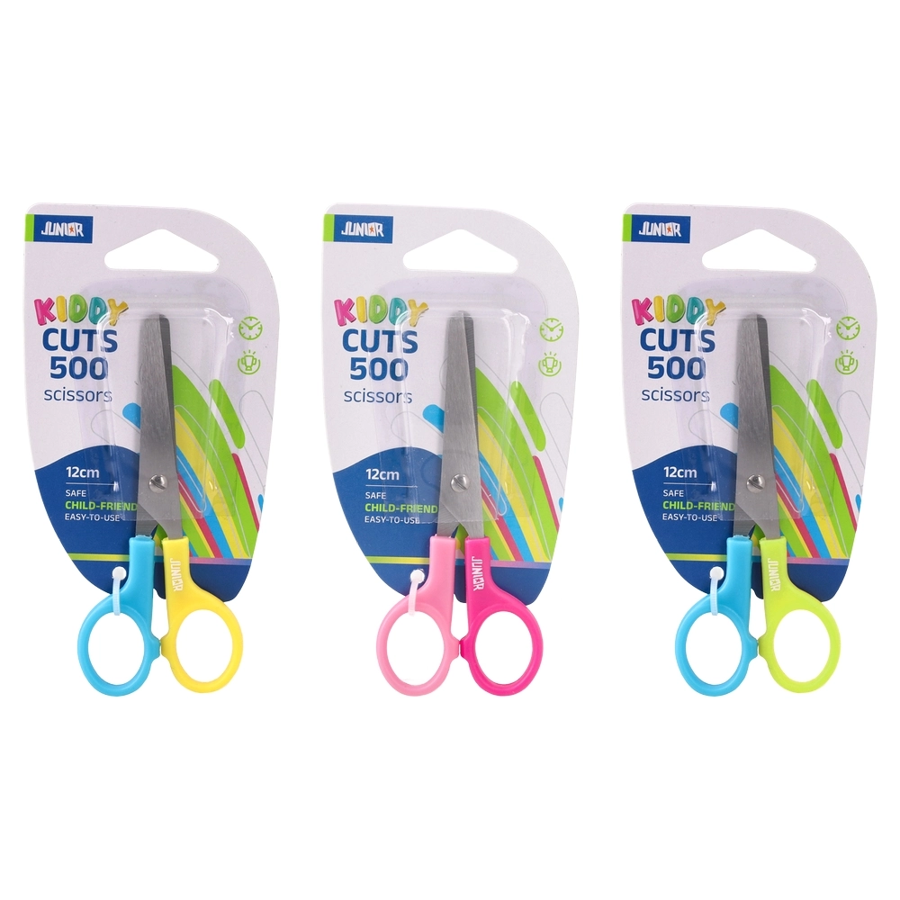 Kiddy cuts, scissor, blister, 12cm. Compact children’s scissors with rounded tips and durable metal blades for controlled cutting. Trendy two-tone plastic handles provide a comfortable grip. Supplied in retail-ready blister for strong shelf impact, protection, and easy presentation.