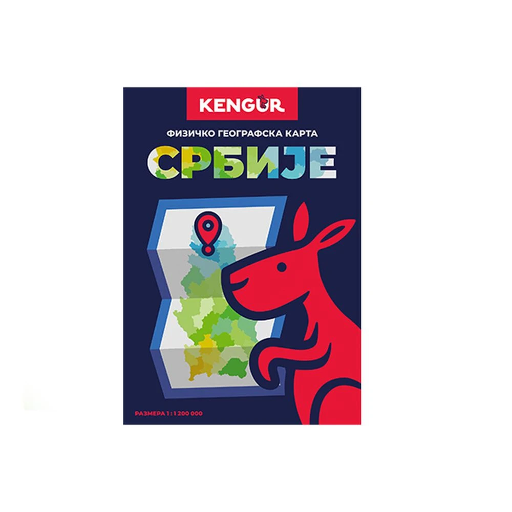 Professional physical map of Serbia by Kengur. Contemporary cover design with bold colors enhances shelf appeal. Clear, color-differentiated terrain for quick orientation. Scale 1:1,200,000. Quality print suitable for educational, corporate or retail assortments.