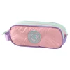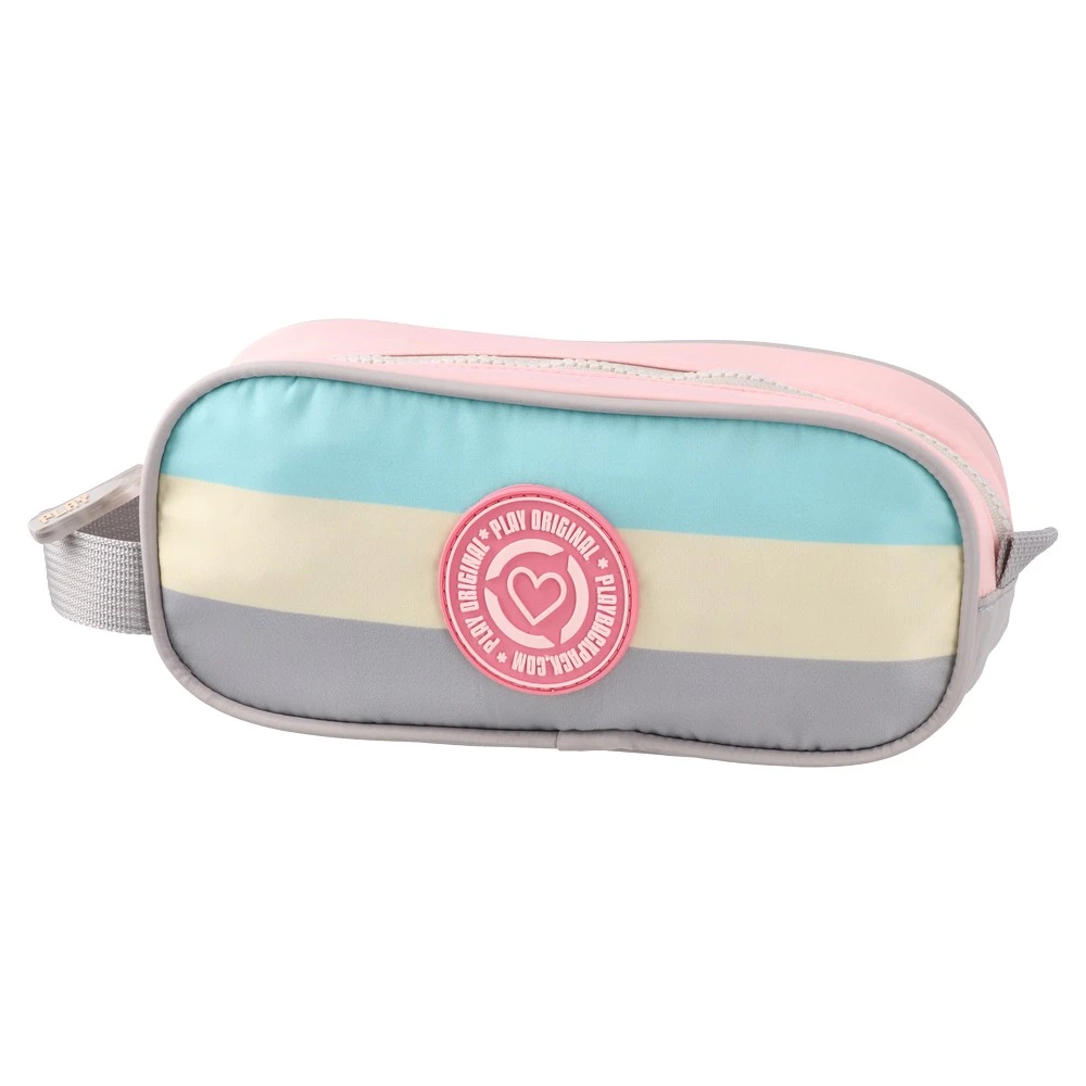 Lady, pencil case, Pastel stripe. Trendy color-block design in pink, aqua, cream, and grey. Fabric exterior with contrast piping and a rubber front badge. Secure zip-top main compartment plus side webbing loop for easy carry. Clean, modern look suited to school and office sales.