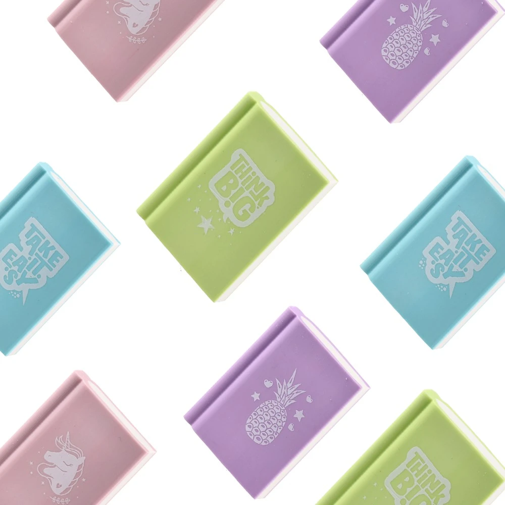 Libri, eraser, pastel, mix: Book-shaped erasers in assorted pastel shades with clean lines and white graphic prints (unicorn, pineapple, Think Big, Take It Easy). Compact rectangular form with a spine detail echoes a mini book. Colors include mint, lilac, pink, and aqua.