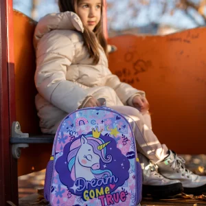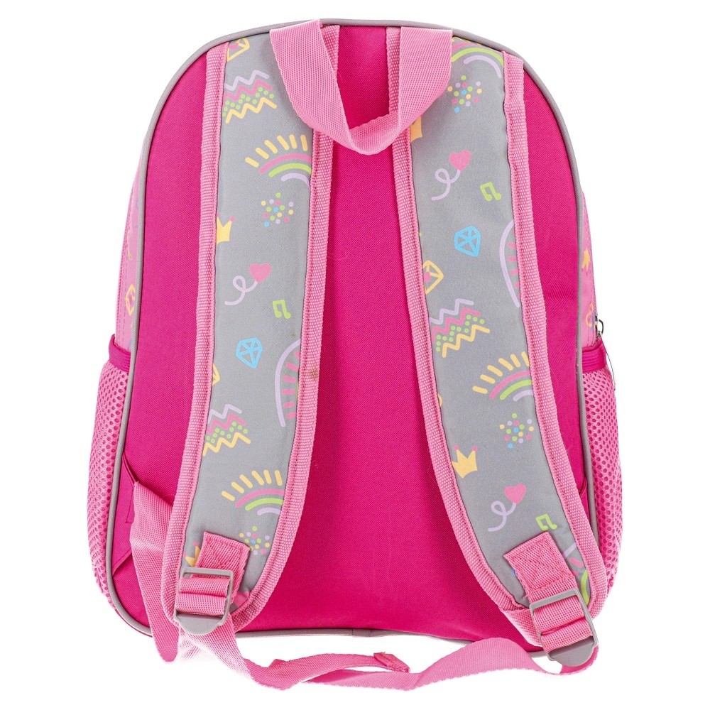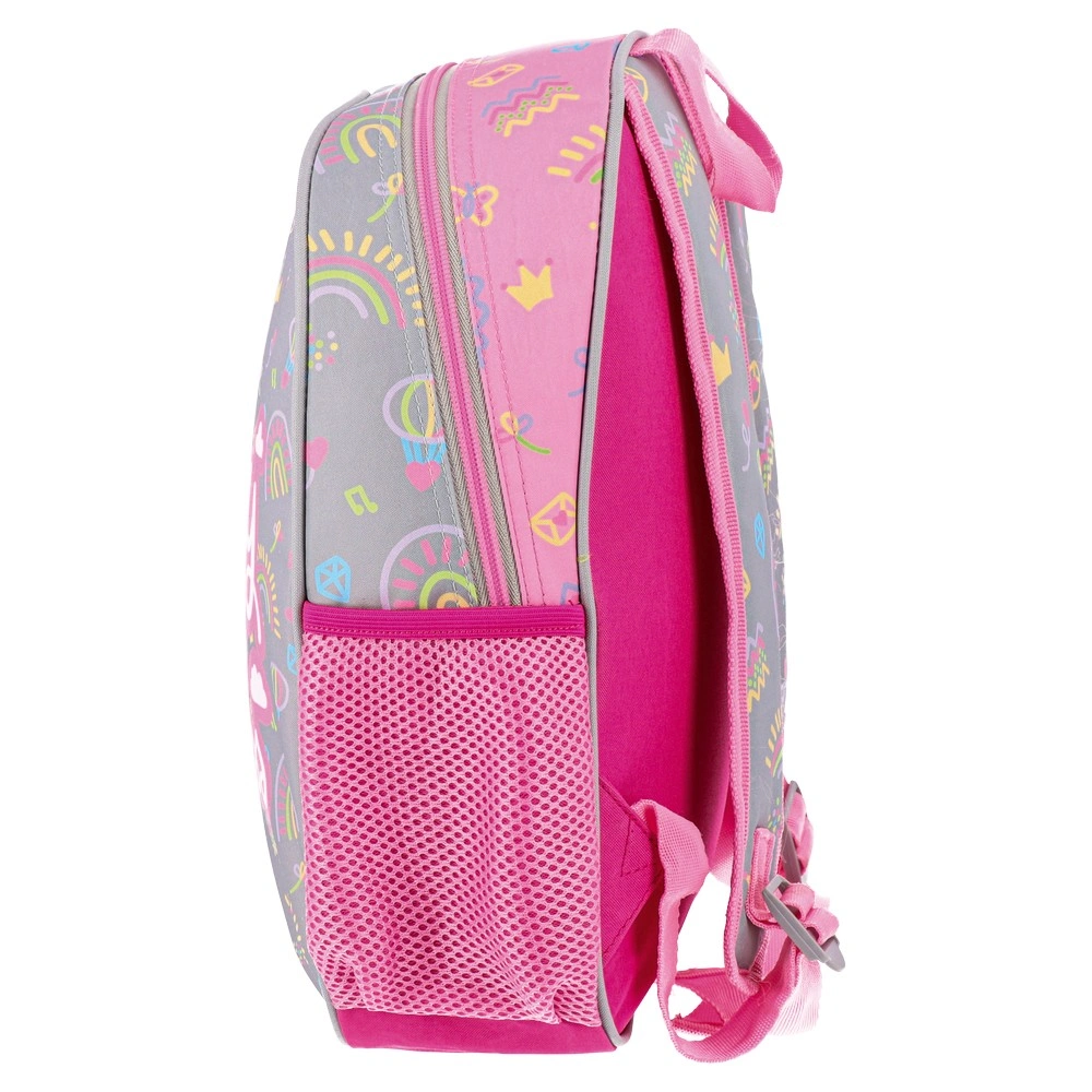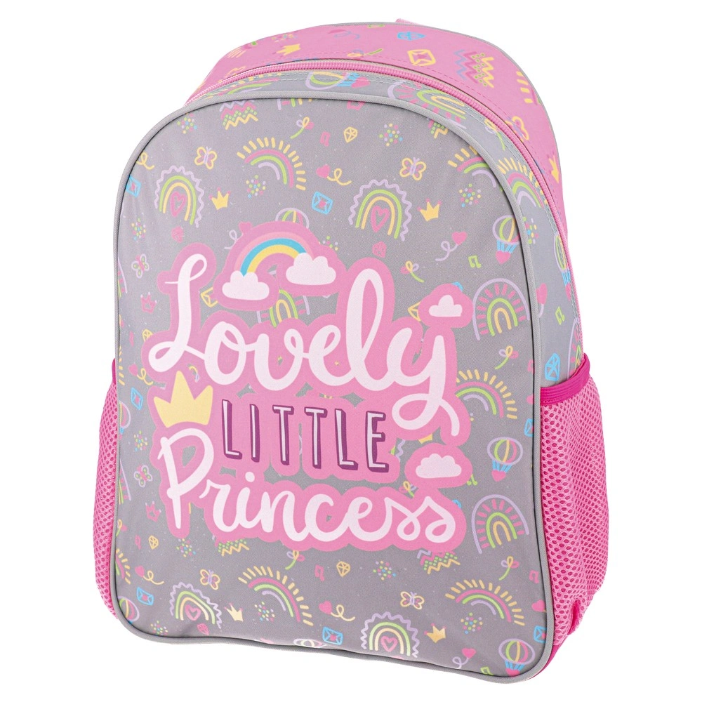 Trendy preschool backpack in a gray-and-pink palette with a bold “Lovely Little Princess” print, rainbows, and playful icons. Durable printed fabric, main zip compartment, and one pink mesh side pocket. Strong shelf appeal for preschool lines and gift selections.