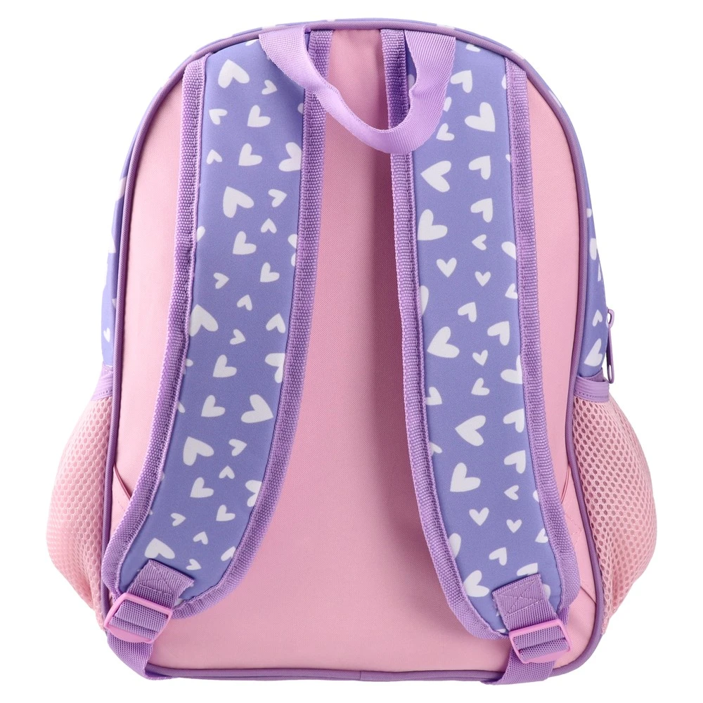 Limo preschool backpack featuring Uni BFF artwork in pastel pink and purple. Large “Always Together BFF” print with heart accents and a heart-pattern top. Zip-around main compartment and dual mesh side pockets. Eye-catching design with strong shelf appeal for preschool buyers.