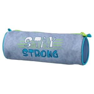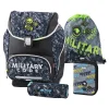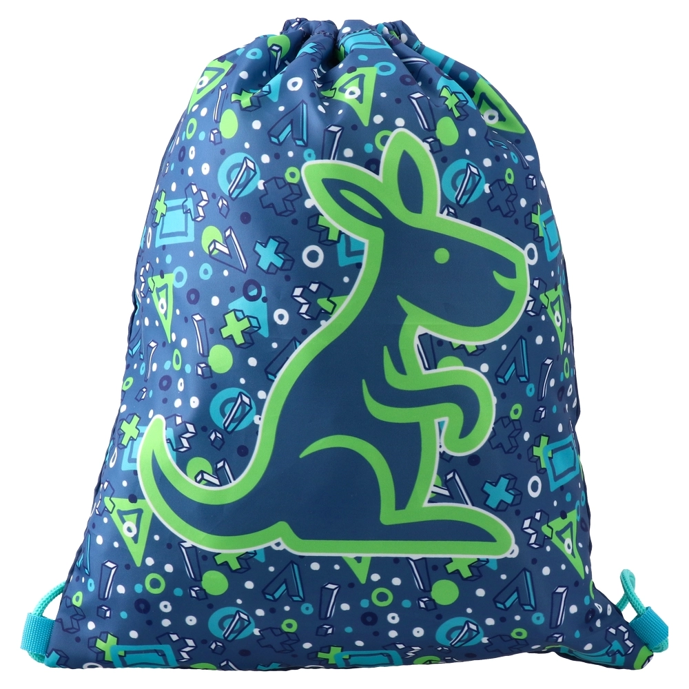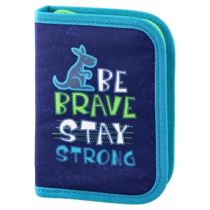 4-piece school set featuring an anatomic backpack, drawstring bag, zip pencil case, and cylinder pouch. Trendy navy/green kangaroo graphics with BE BRAVE/STAY STRONG prints. Structured backpack with secure front clasp, front pocket, and reflective strip for visibility.