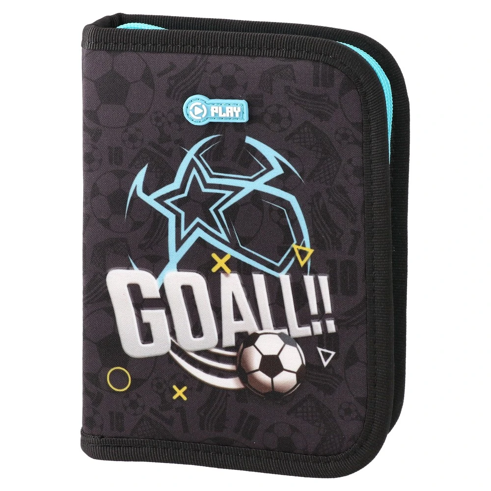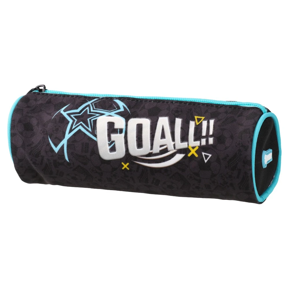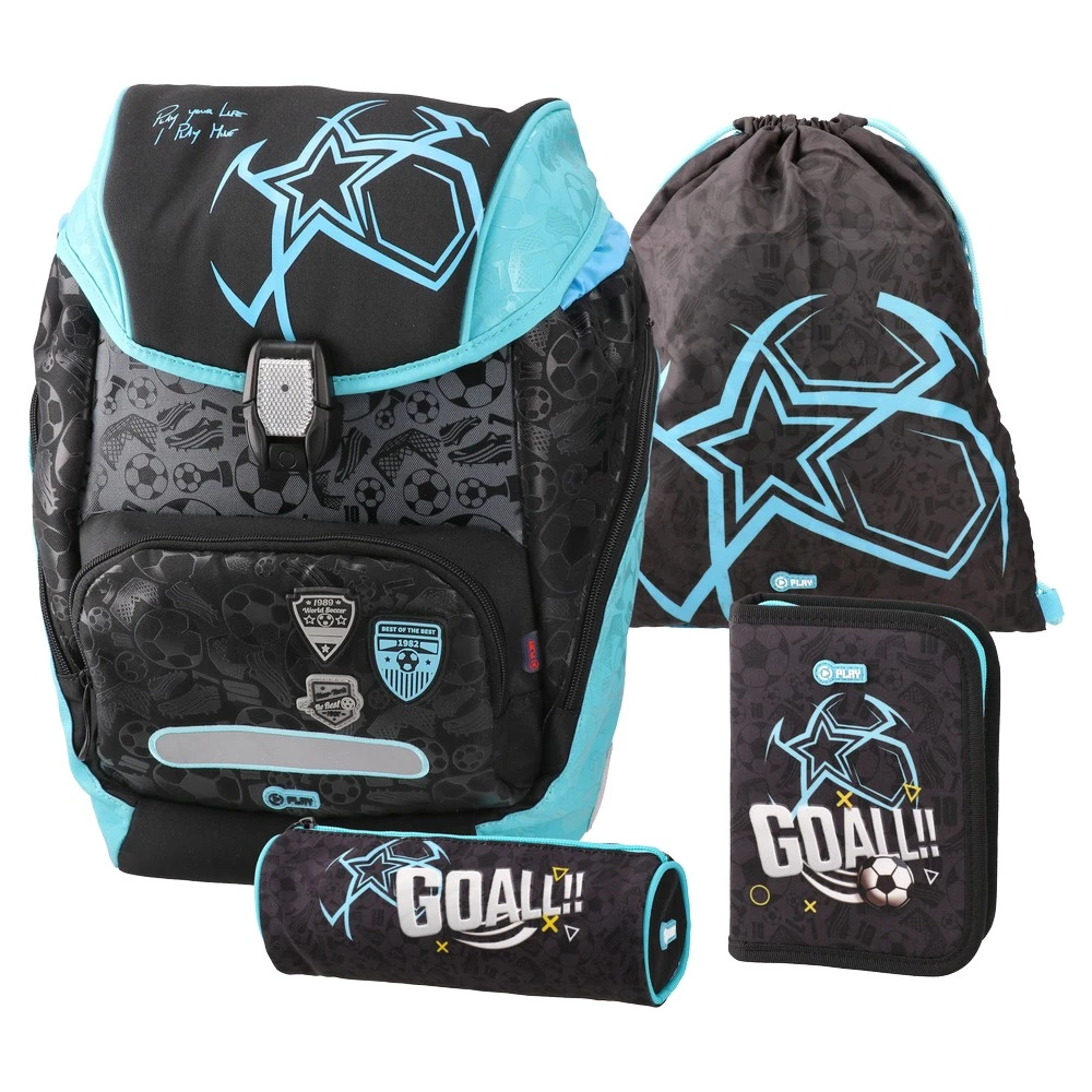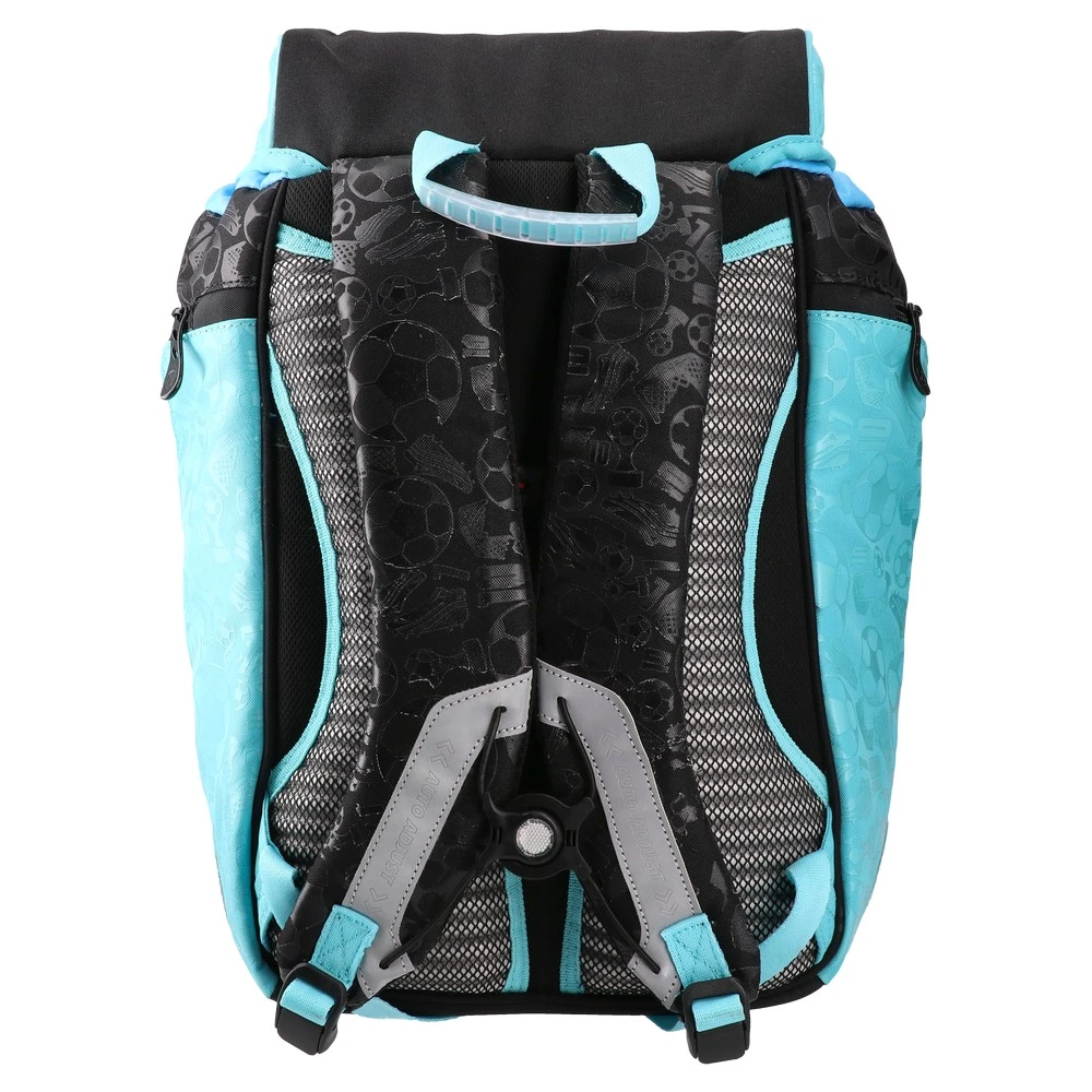Logic set, anatomic backpack, 4 in 1, Legendary Football. Coordinated kit with anatomic backpack featuring buckle closure, front pocket and reflective strip, plus drawstring gym bag, zip folio and round pencil case. Bold black/turquoise football graphics deliver strong shelf impact.