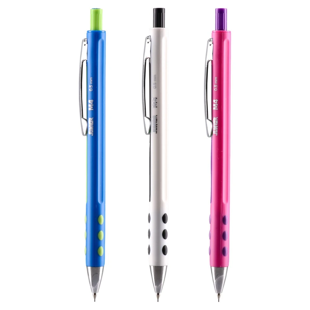 M4 mechanical pencil, 0.5mm. Box of 12 with vibrant barrels and a special ergonomic grip for secure handling. Produces clean, precise 0.5mm lines for drafting, lists, and everyday writing. Trendy dot‑grip design boosts shelf appeal for offices, schools, and bulk supply.