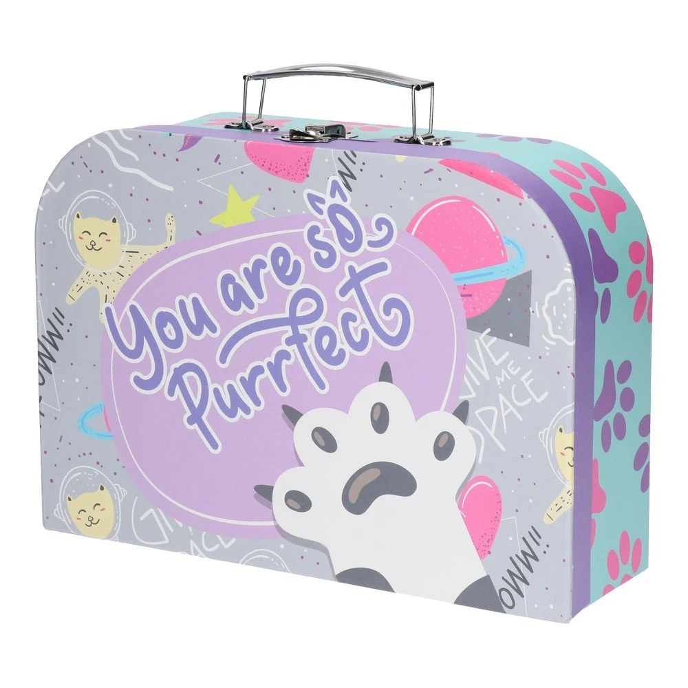 Maleta, filebox with handle, Paw: Trend-led storage featuring cat-and-paw artwork and a bold “You are so Purrfect” graphic. Rigid case with rounded silhouette, metal handle and latch for easy carry and secure closure. Giftable, display-ready piece for documents, art, or small keepsakes.
