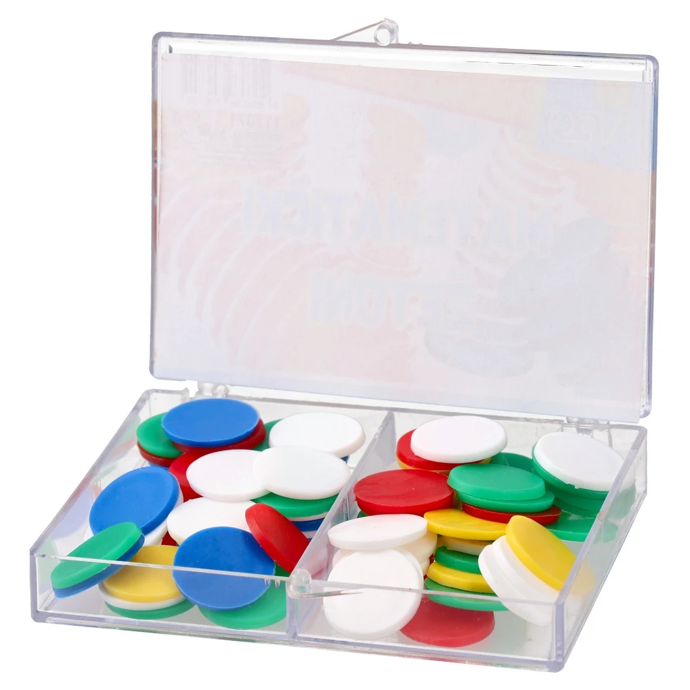 Durable PVC math chips in assorted colors, 80 pcs. Trendy, vibrant look supports engaging counting and grouping activities in schools and training centers. Supplied in a compact transparent case for organized storage and transport. Ideal for classroom demonstrations.