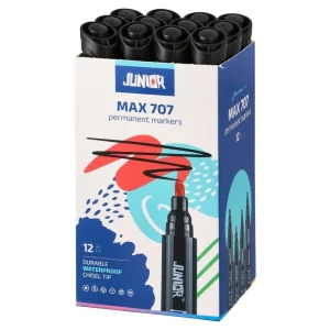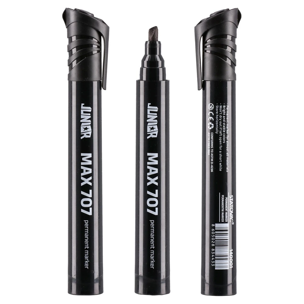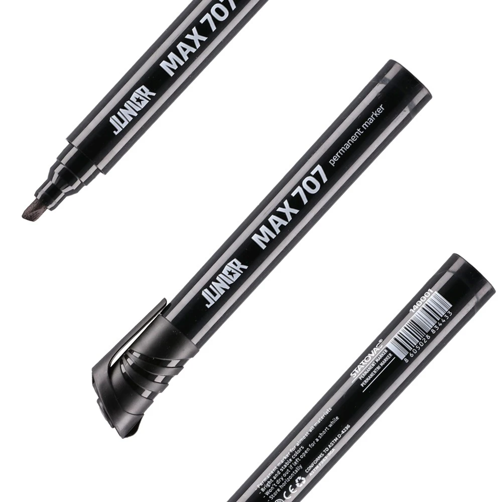 Max 707 permanent marker, chisel tip, black. Delivers bold, lasting marks with variable line widths for labeling and signage. Sleek black barrel with crisp white graphics fits modern workspaces. Durable plastic body and secure cap support frequent use in offices and warehouses.
