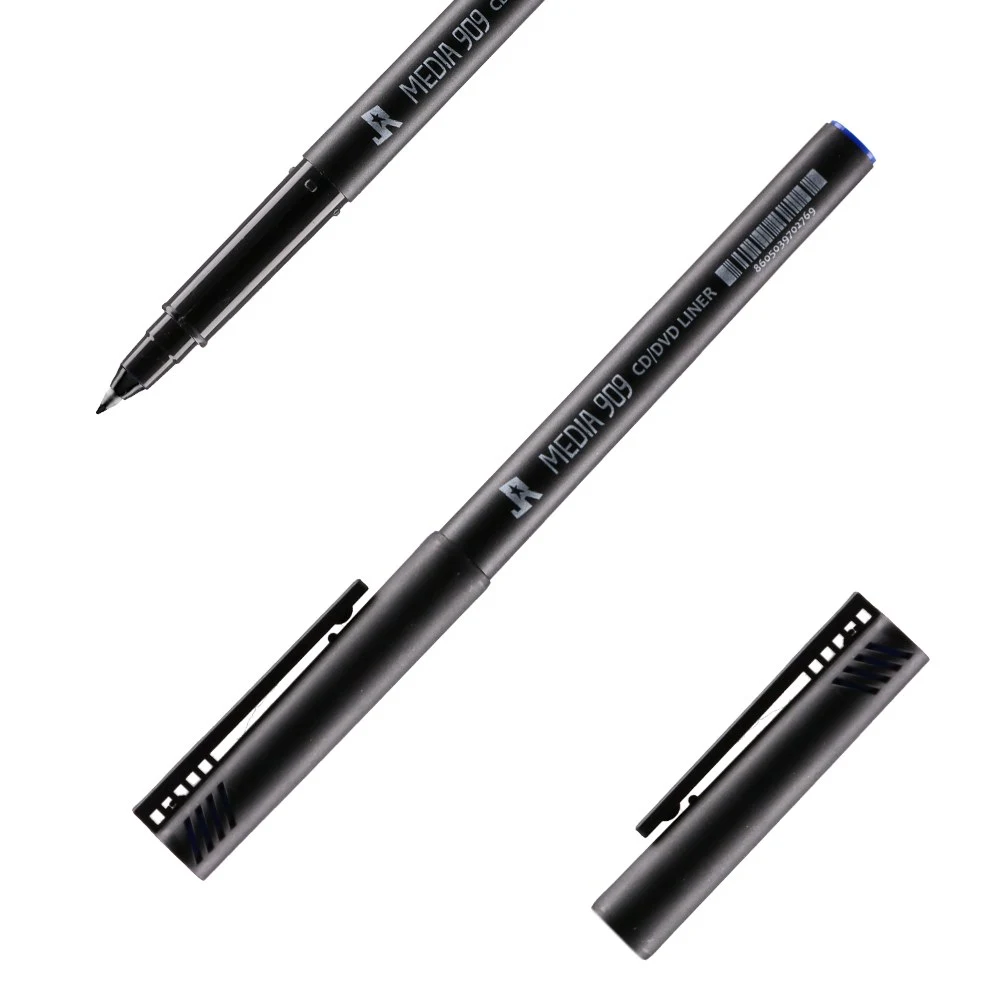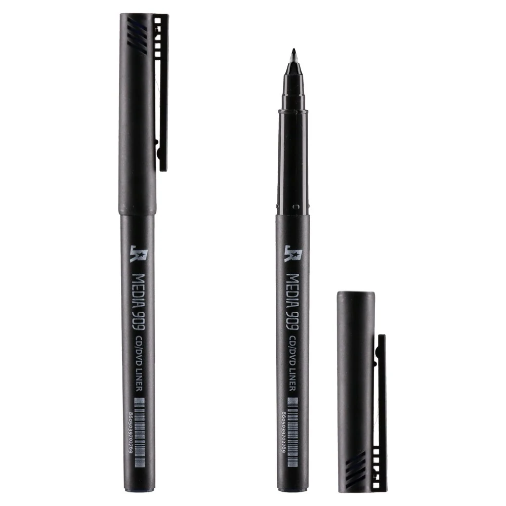 Media 909, liner for CD, 0.6mm, black. Minimalist matte barrel with secure cap. Fine point delivers precise, readable marking on CD/DVD surfaces for archiving and duplication. Consistent line quality and a professional look make it a reliable, high‑turnover choice for media workflows.
