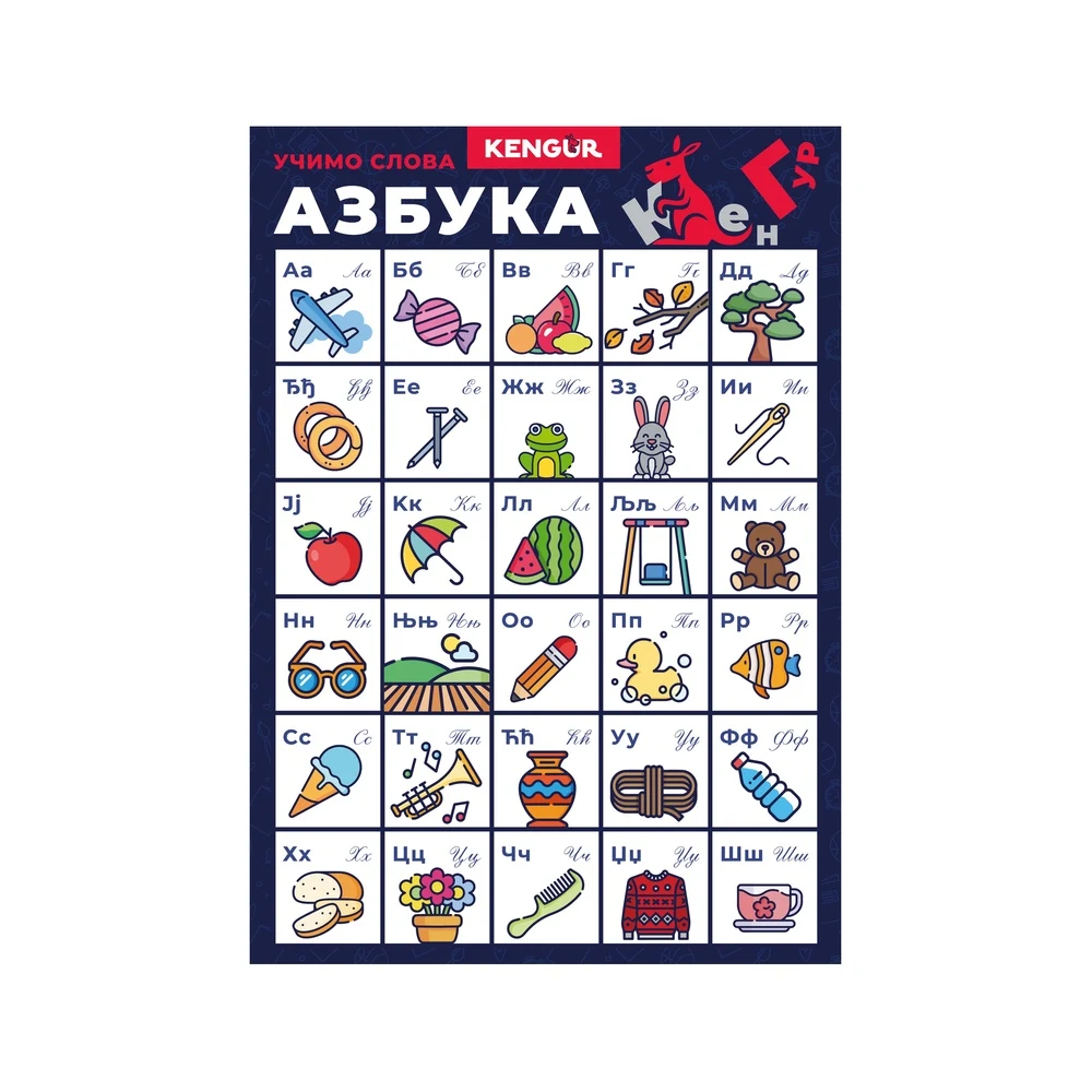 Mensa M poster, A5. Compact learning aid featuring the Cyrillic alphabet with clear uppercase/lowercase pairs and bold, colorful illustrations. Modern grid layout supports quick letter recognition. Ideal for early-learning assortments, classrooms, and retail displays.