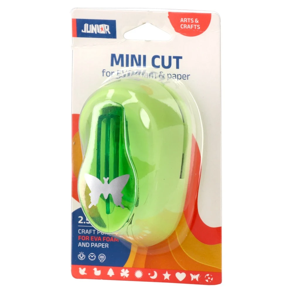 Mini Cut 25 butterfly punch, 2.5 cm, for Jolly EVA foam. Trendy lime body with translucent lever. Produces clean butterfly cutouts on foam and paper for consistent results. Compact and easy to merchandise, ideal for cardmaking, scrapbooks, tags and DIY craft ranges.