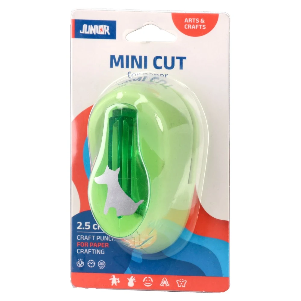 Mini Cut 25 Dog Punch creates clean 2.5 cm dog silhouettes in paper. Contemporary lime‑green design with translucent lever improves visibility and control. Robust plastic housing, compact footprint, and consistent cuts suit scrapbooks, cards, tags, and high‑volume craft stations.