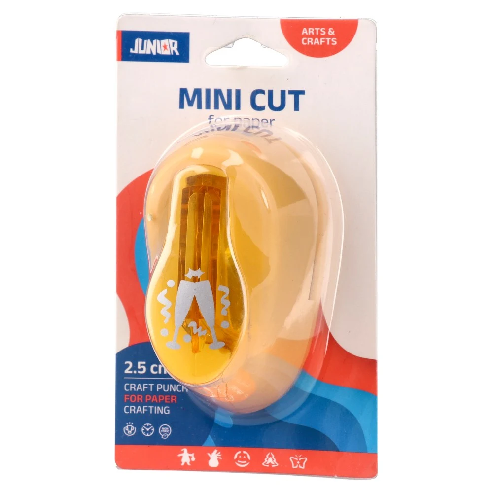 Mini Cut 25, party Jolly paper punch. Cuts a sharp 2.5 cm celebratory motif for cards, invitations and packaging. Trendy compact design in yellow with a translucent lever for comfortable use. Durable plastic housing ensures consistent, clean results for repeatable production.