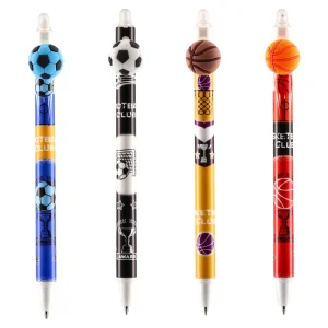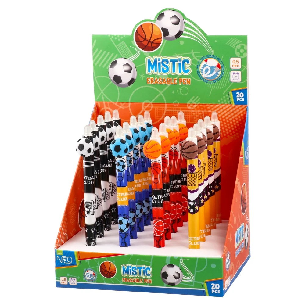 Mistic erasable pen delivers smooth blue writing with a fine 0.5mm tip. Trend-led Cool Sport design features vibrant prints and 3D ball toppers that command attention. Durable plastic barrel and clean erasability boost everyday use. A strong seller for school and gift retail.