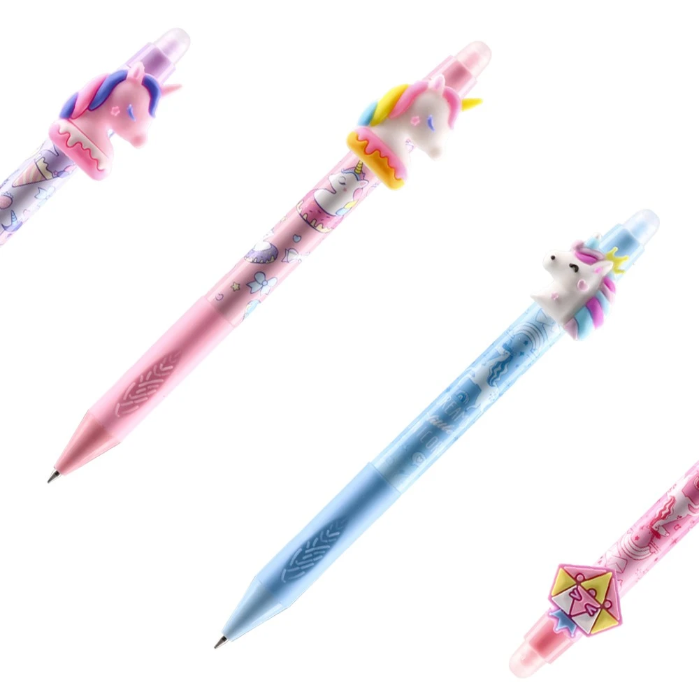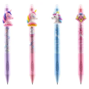 Mistic erasable pen, blue, 0.5mm. Trendy design with a 3D unicorn topper and pastel printed plastic barrel that stands out on shelf. Erasable ink allows clean corrections. Fine line suits planners and notes. Strong visual appeal for school, stationery, and gift assortments.