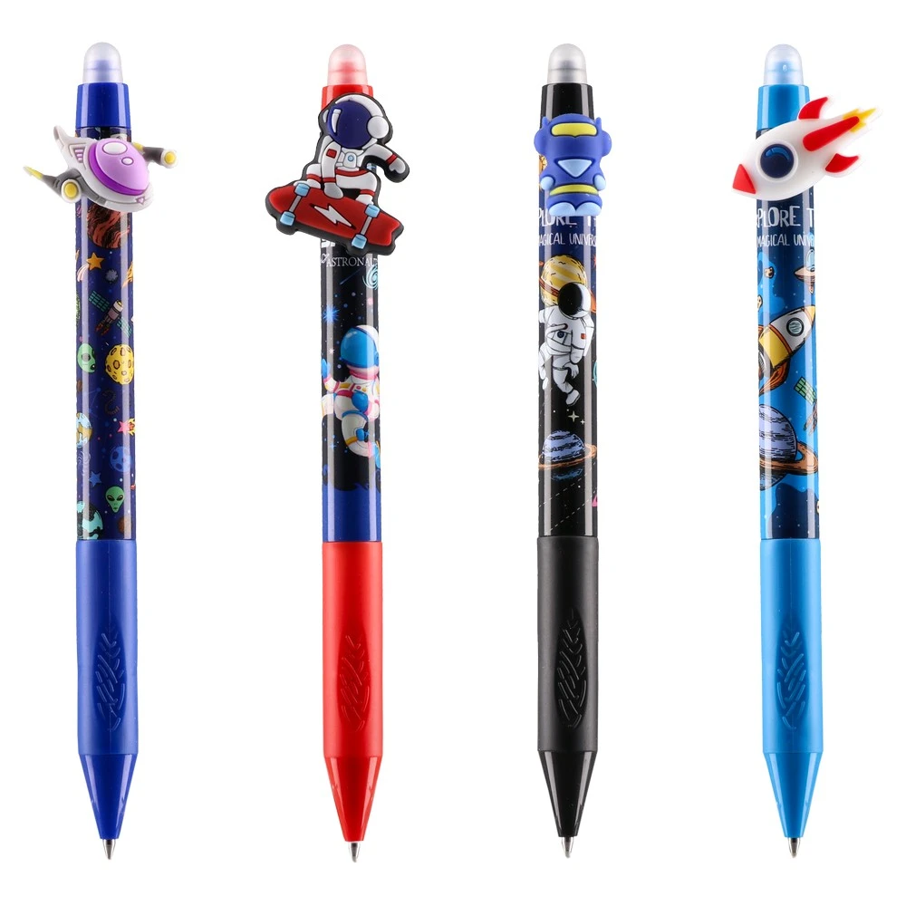 Mistic, erasable pen, blue, 0.5mm, Space chase. Trend-led space graphics with a 3D topper deliver standout shelf appeal. Durable plastic barrel, fine 0.5 mm point, and blue erasable ink for clean corrections. Ideal for impulse displays in school and stationery ranges.