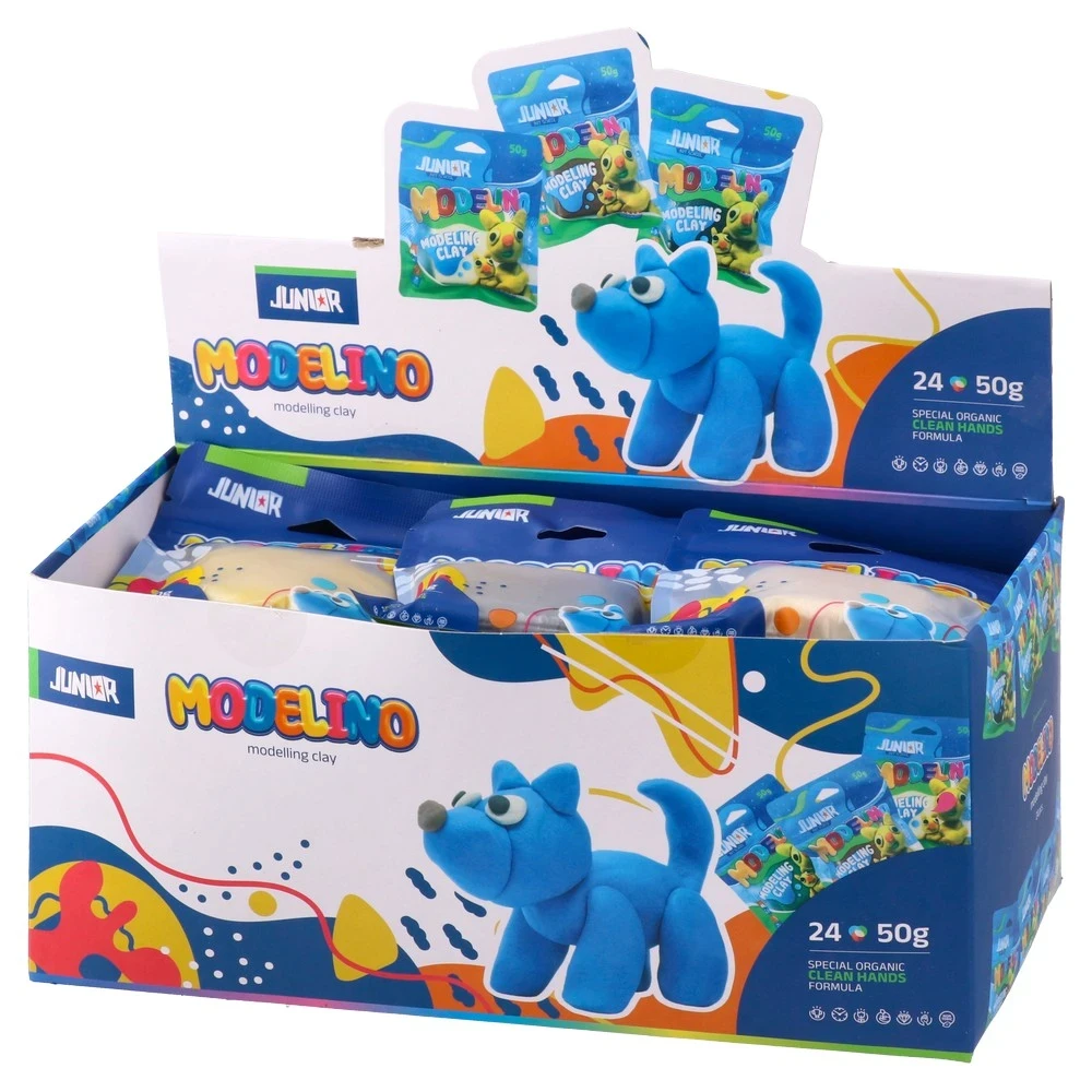 Modelino, modeling clay, mix, 50g. Bright, modern packaging designed for standout shelf appeal. Mixed colors support diverse creations. Clean-hands formula stated on pack. Compact 50 g size suits single projects and impulse buys, making it a practical, sellable choice for retail and education.