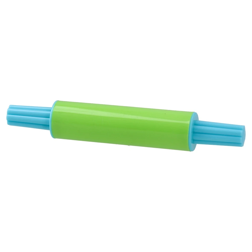 Moldy rolling pin for modeling clay featuring a smooth green plastic barrel with blue handles. The bright, modern colorway stands out on shelves. Provides even rolling for craft projects. Supplied in a clear, header-card hanging pack, ready for retail and classroom use.