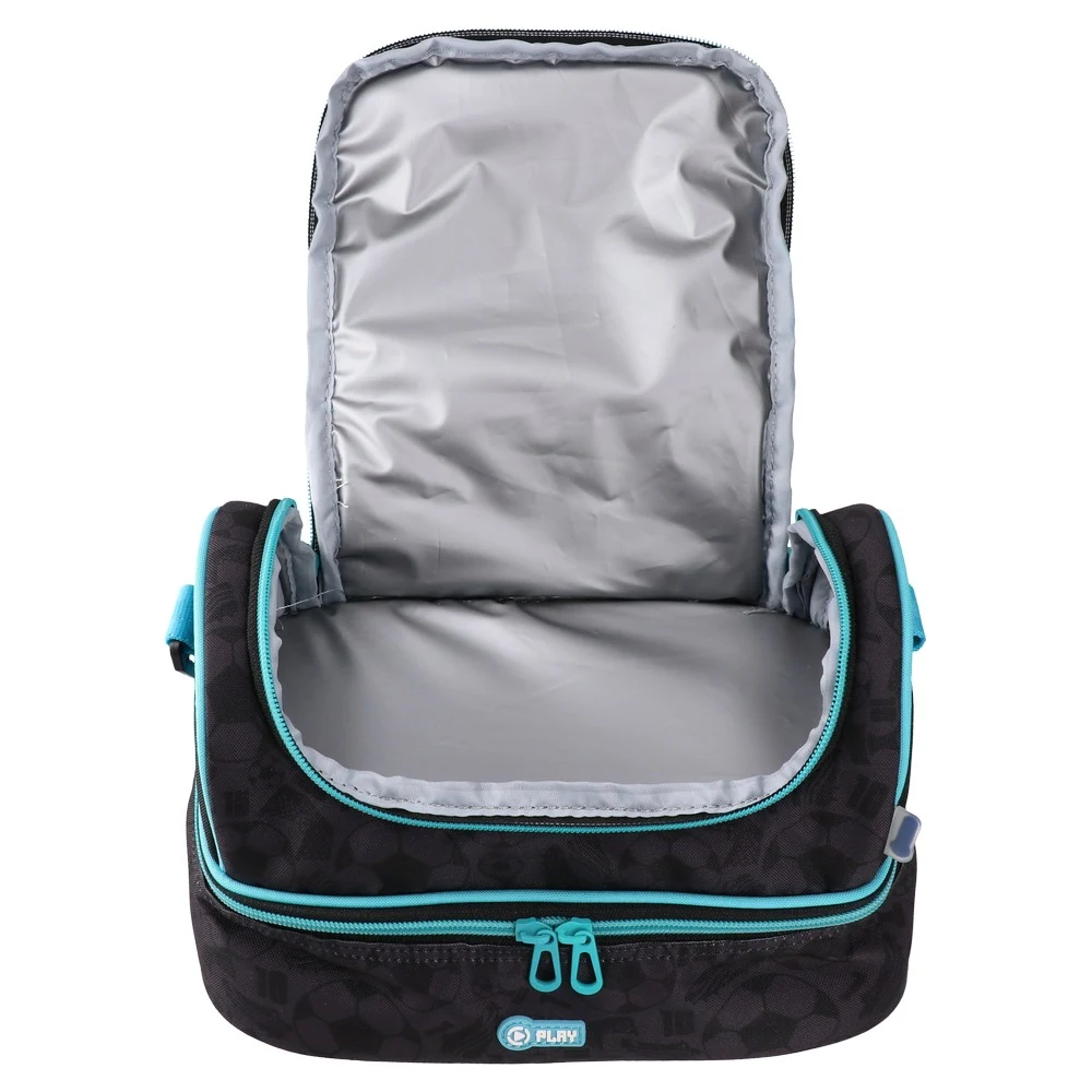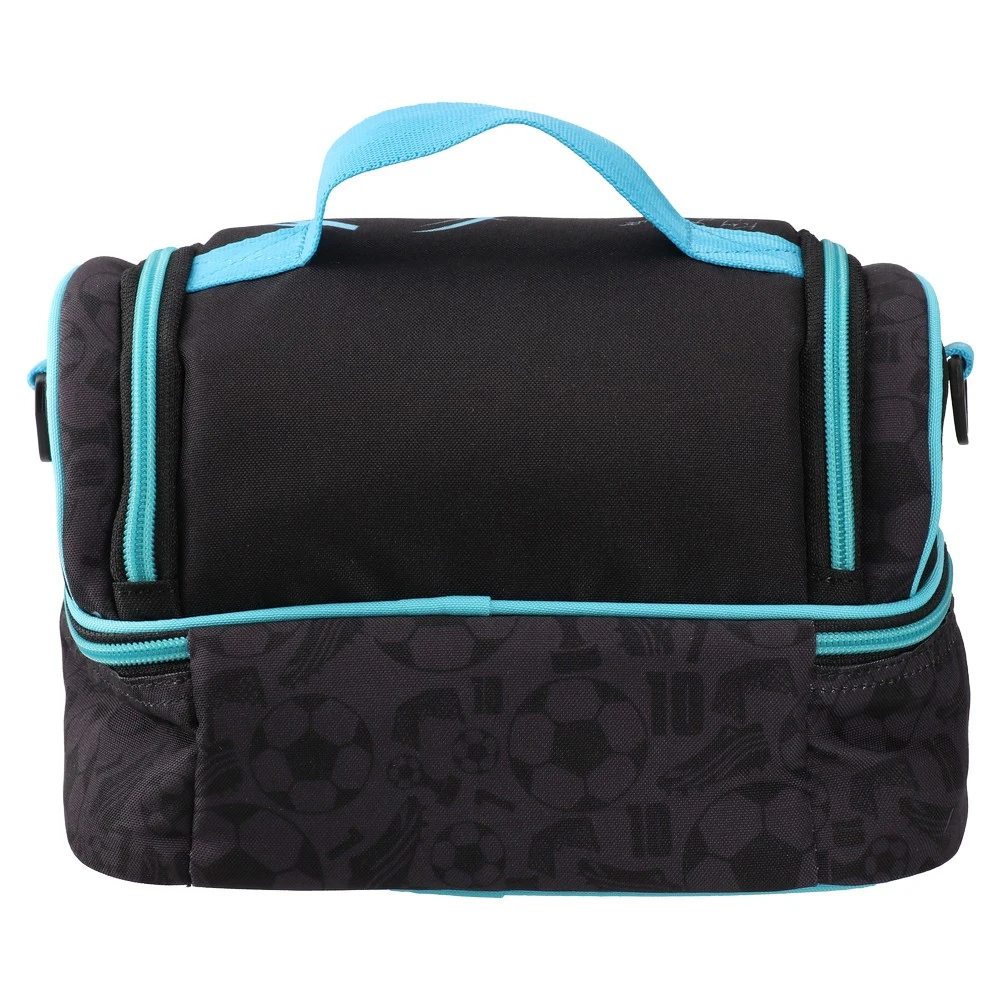 Nupra, lunch bag, Legendary Football: modern two-tier design with dual zip compartments for organized packing. Black fabric with tonal football pattern and bold cyan accents, star graphic, and contrast piping. Features top handle, adjustable detachable strap, and robust zipper pulls for daily use.