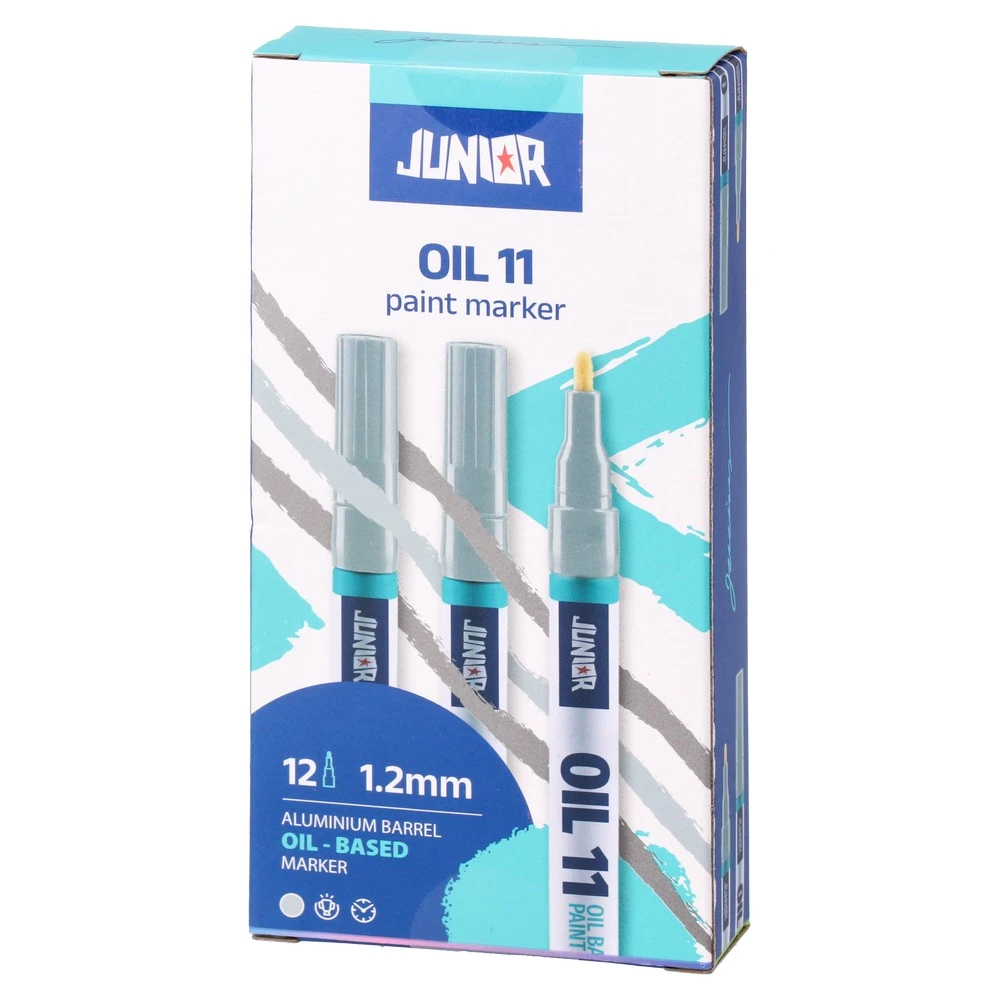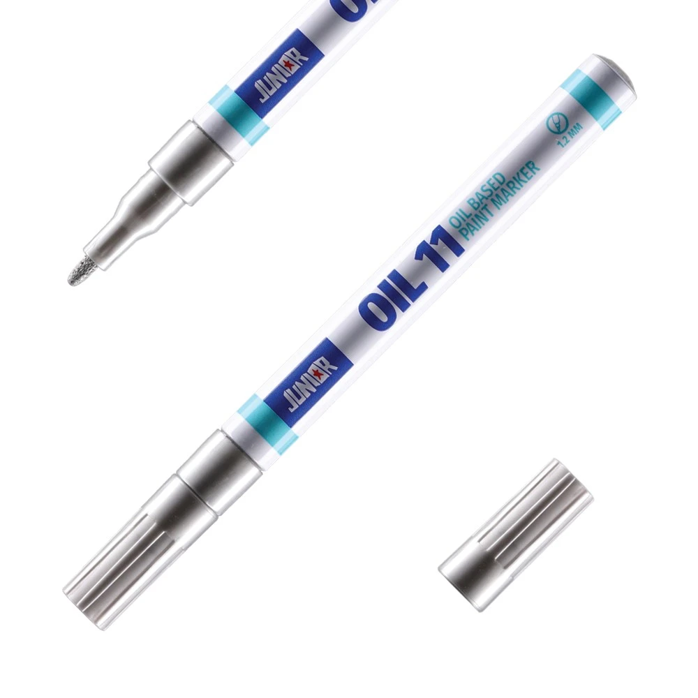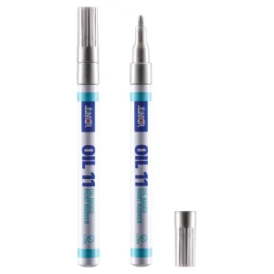 Oil 11 paint marker, fine, silver. Oil-based marker featuring a sleek, slim barrel and metallic cap. Fine 2 mm tip (as indicated on barrel) draws crisp silver lines for precise marking and labeling. A clean, modern design built for professional workflows.