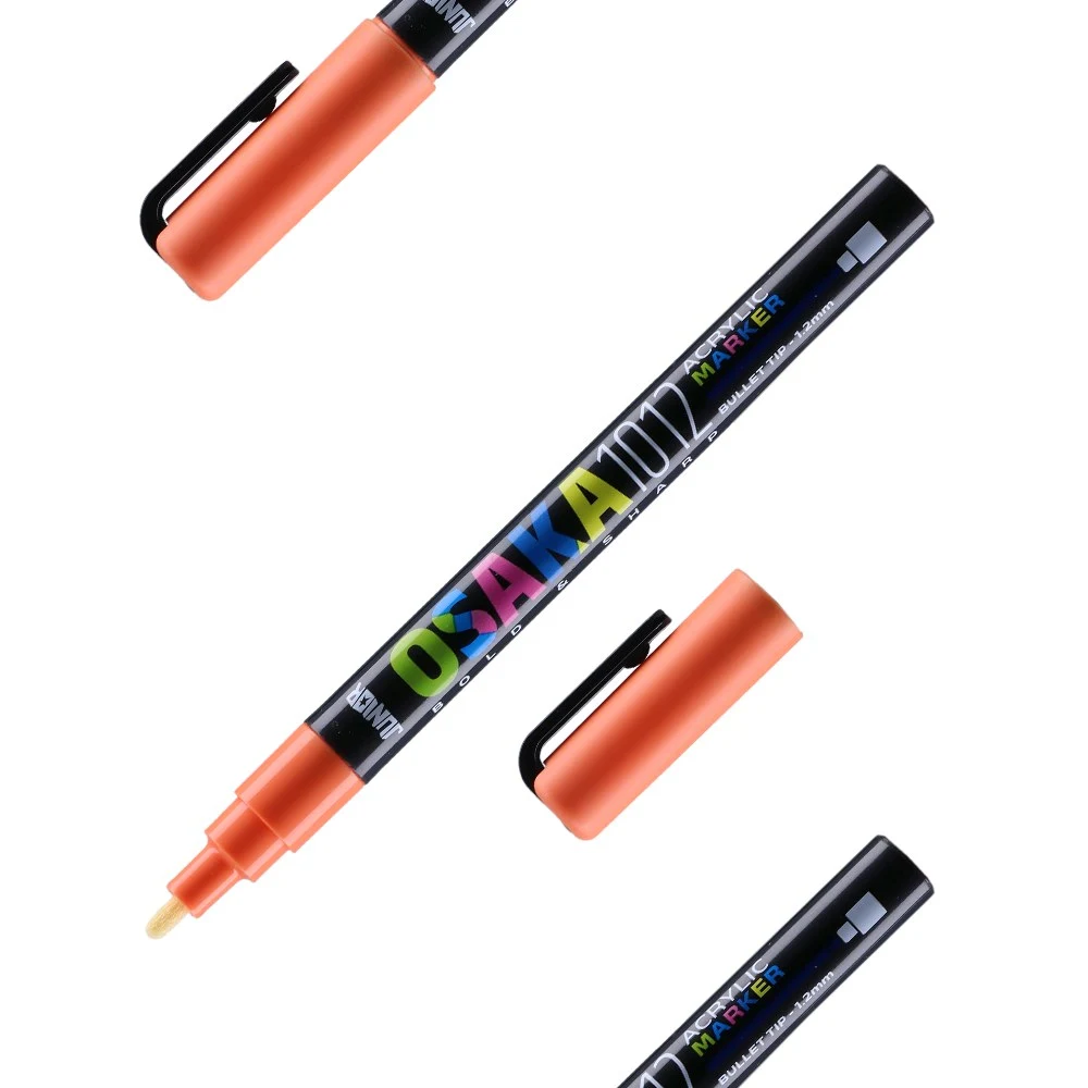 Osaka 1012 acrylic marker with 1.2 mm bullet tip for fine, controlled lines in orange (R 608). Sleek black barrel with vibrant logo and a color‑matched cap with clip enhances shelf appeal and quick color ID. Clean line performance suits detailed marking, outlining, and labeling.