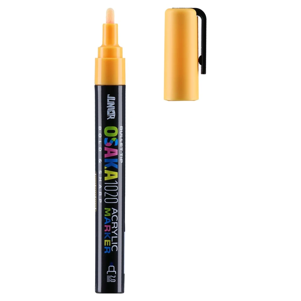 Osaka 1020 acrylic marker in Marigold Y 416 with a 2.0 mm bullet tip for clean, even strokes. Sleek black barrel and color-matched cap with clip create a modern, shelf-ready design. Acrylic-based and built with solid plastic components for dependable, professional use.