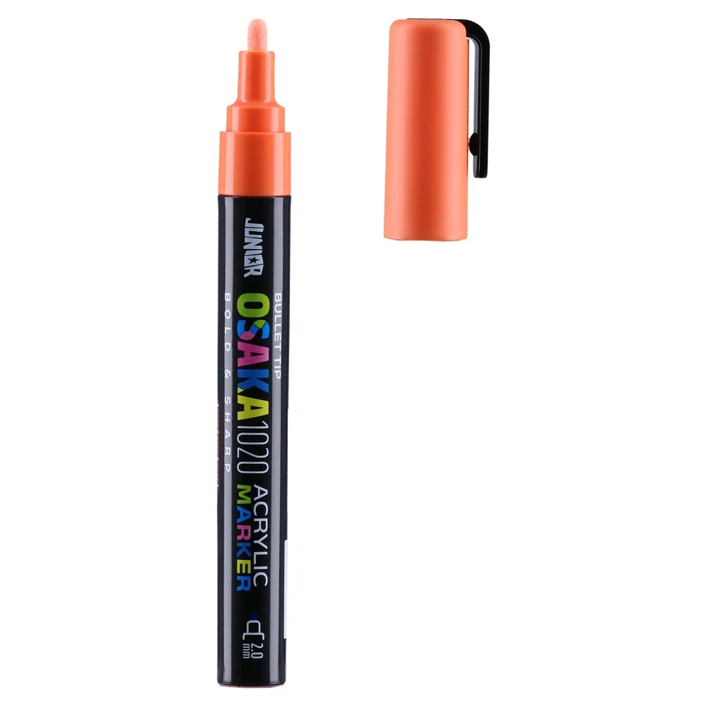 Osaka 1020 acrylic marker, 2.0 mm bullet tip, orange brown R 608. Modern black barrel with color-matched cap and clip. Acrylic color applies evenly for crisp lines and solid fills. Durable plastic build and bold branding make it a sellable, professional-grade choice.