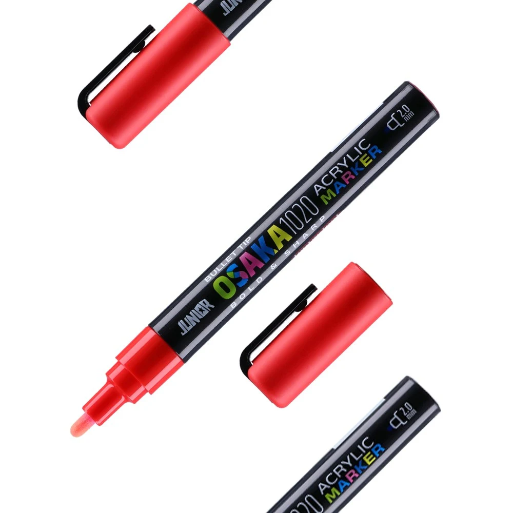 Osaka 1020 acrylic marker, 2.0 mm bullet tip, orange red Y418. Sleek black barrel with bold graphics and a red clip cap gives a modern, standout look. Acrylic color and the precise tip deliver clean, consistent lines for professional marking and creative work.