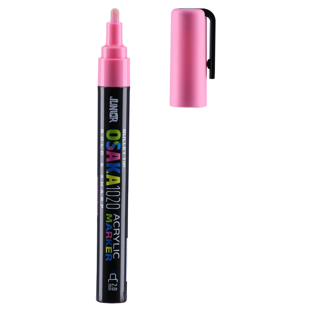 Osaka 1020 acrylic marker with 2.0 mm bullet tip in pink R 605. Sleek black barrel with pink cap and clip. Acrylic color and the firm tip deliver consistent, clean lines for design accents, signage, and labeling. Trend-forward shade and professional styling support strong shelf appeal.