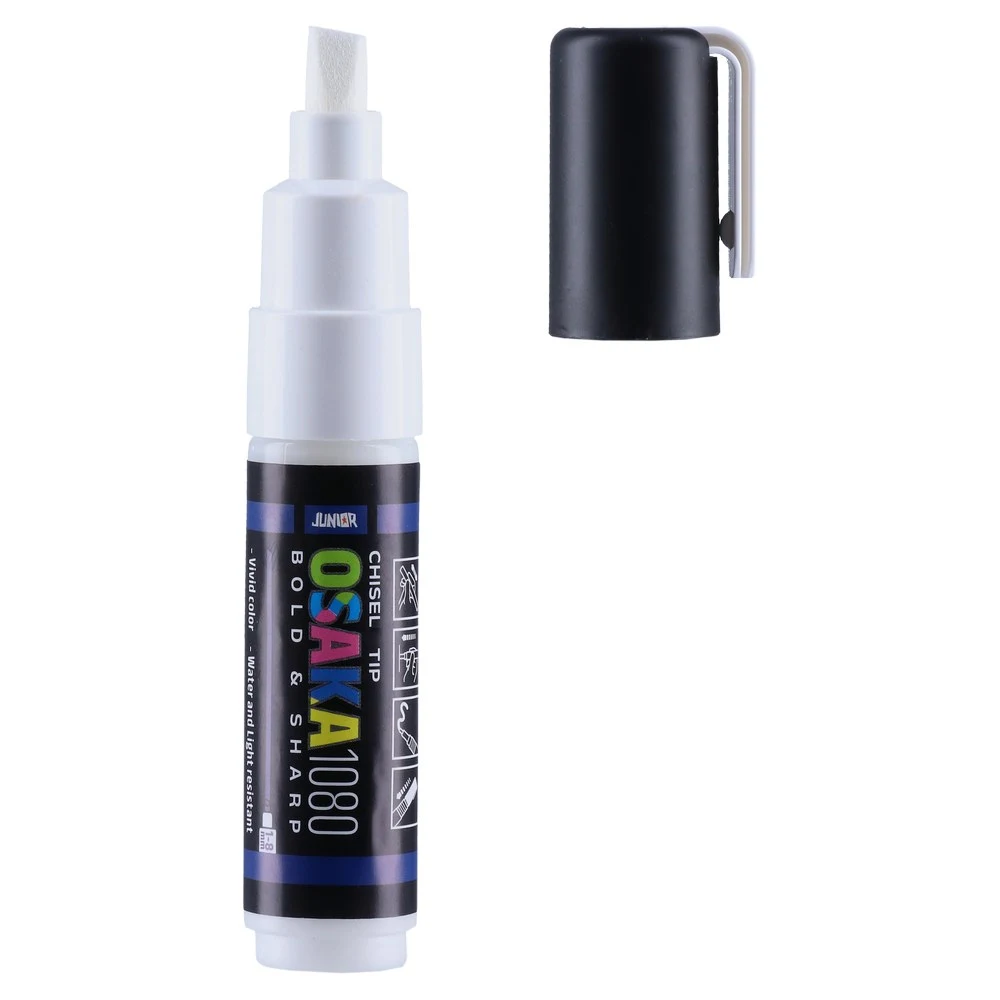 Osaka 1080 acrylic marker in white (W01) with chisel tip, 1–8.0 mm. Sleek white barrel with black clip cap. Produces bold, sharp lines for signage, labeling and displays. Versatile tip allows fine and broad strokes, offering precise control for professional use.