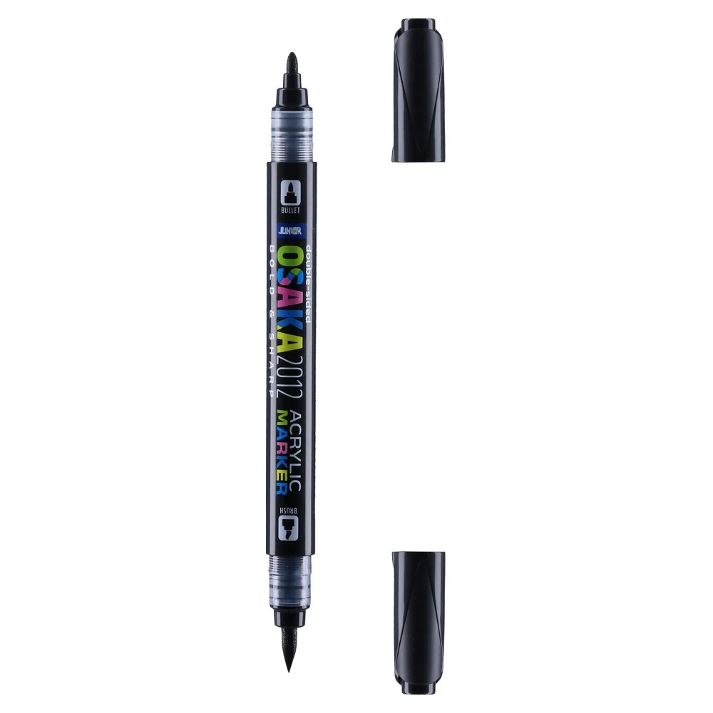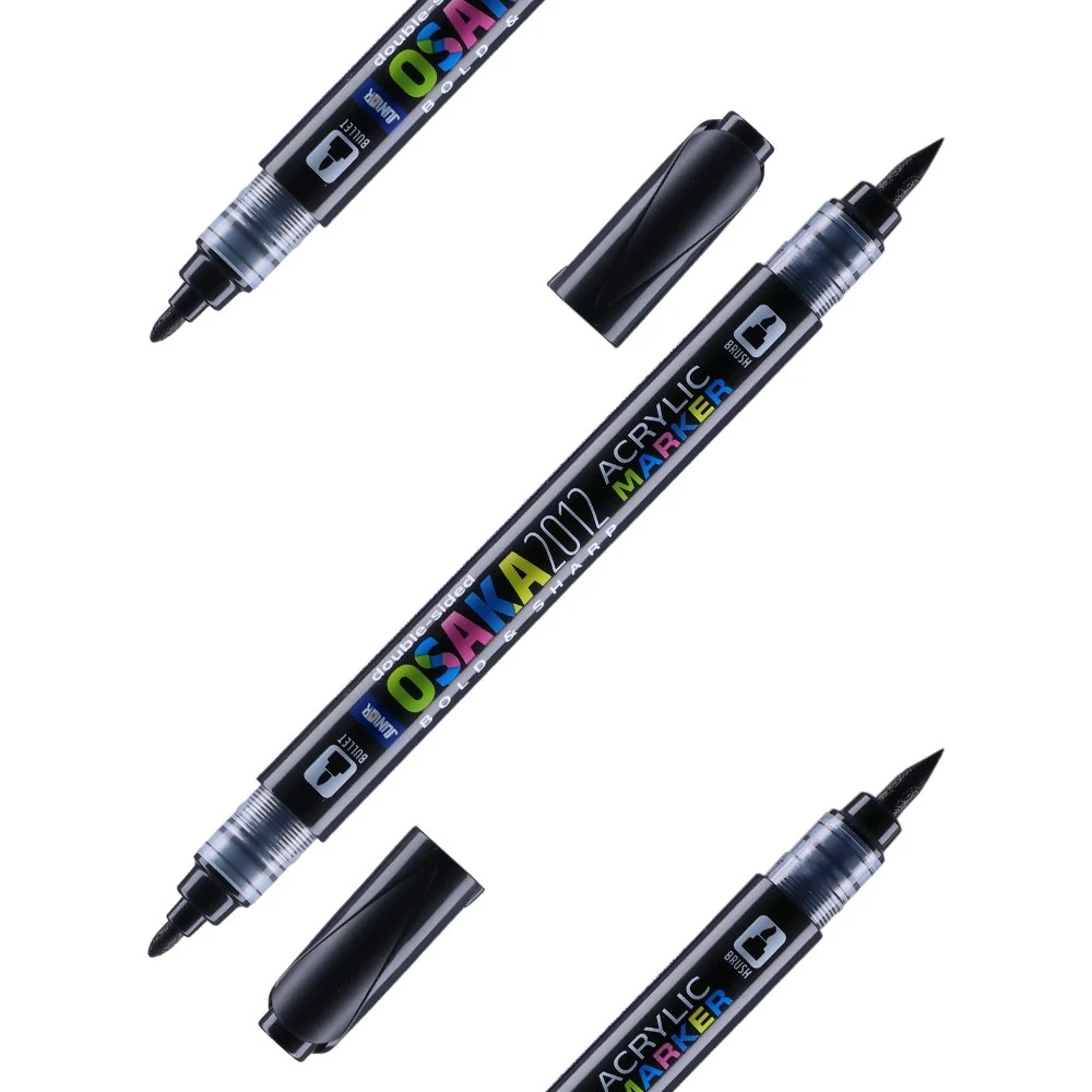 Osaka 2012 Acrylic Marker delivers dual-tip versatility in rich black. The 1.2 mm tip produces clean, controlled lines; the opposite end adds flexibility. A sleek black barrel, transparent collars and protective caps highlight quality and a modern, shelf-ready design.