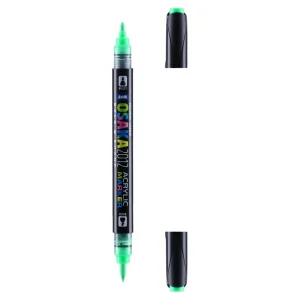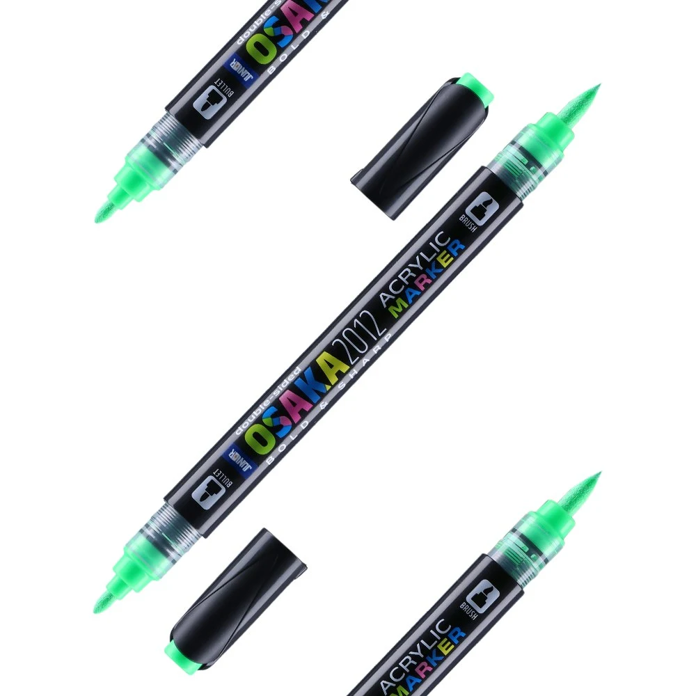 Osaka 2012 acrylic marker, dual-ended in neon green F 434. Fine 1.2 mm tip on one side and a flexible brush nib on the other for precise lines or bold fills. Sleek black barrel with color-coded caps. A modern, sellable option combining acrylic color and dependable control for pro use.