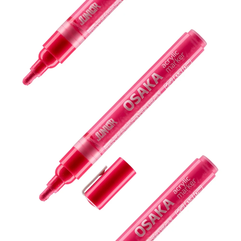 Osaka acrylic marker, pink, offers a vivid, on-trend finish. The sleek, translucent barrel shows ink movement, and the rounded tip supports clean application. Durable plastic cap with clip aids storage and transport. Sturdy build and bold branding boost shelf appeal.