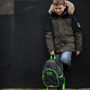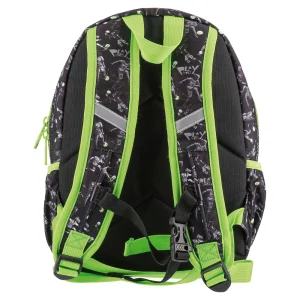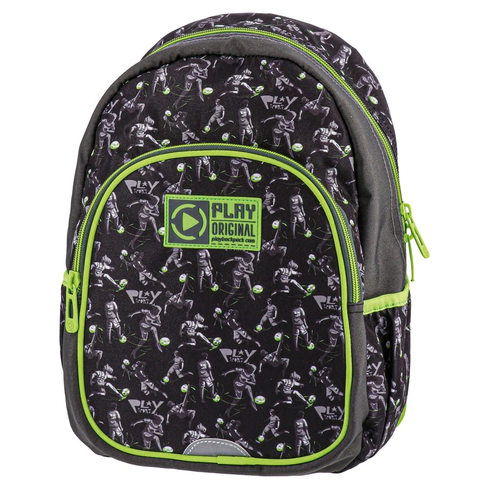P2 preschool backpack in a football theme. All-over player print on black with neon green piping, zips, and Play Original patch. Zippered main compartment and front pocket for organization. Sturdy fabric and neat finishing deliver durability and strong retail appeal.