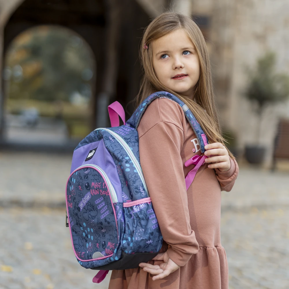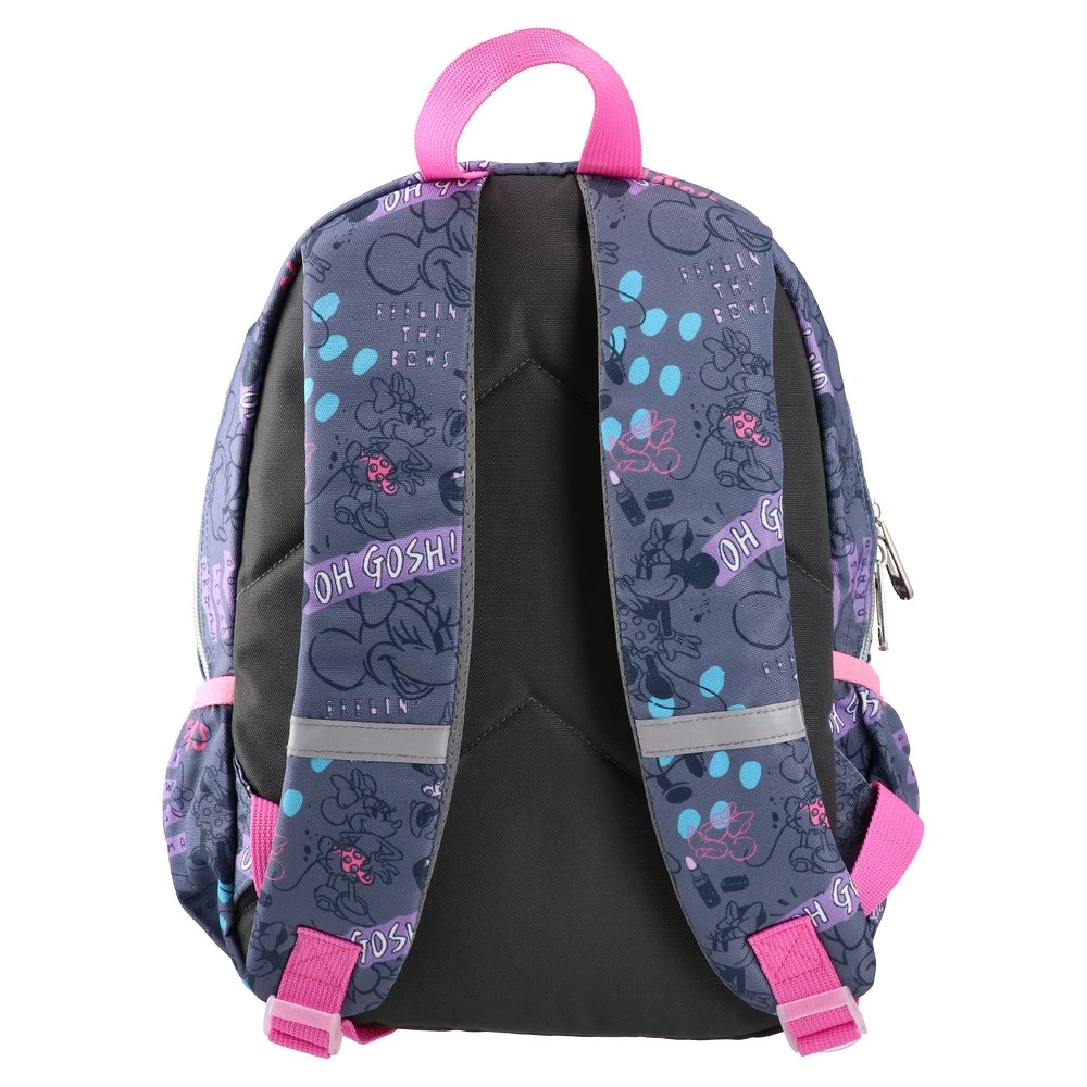 P2 preschool backpack with Disney Minnie Mouse doodle print. Trendy purple/charcoal palette with pink piping boosts shelf appeal. Spacious main zip compartment and front zip pocket for essentials, plus top carry handle. Durable fabric, neat stitching, and contrast zippers. Branded patch adds authenticity.