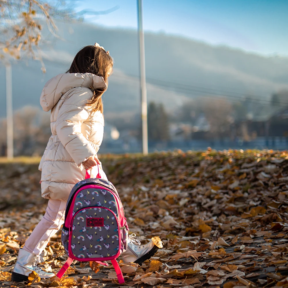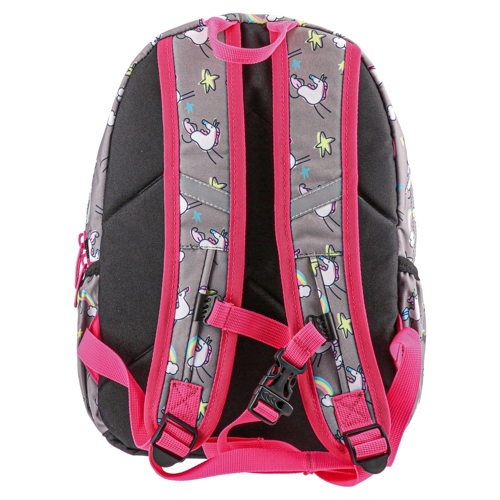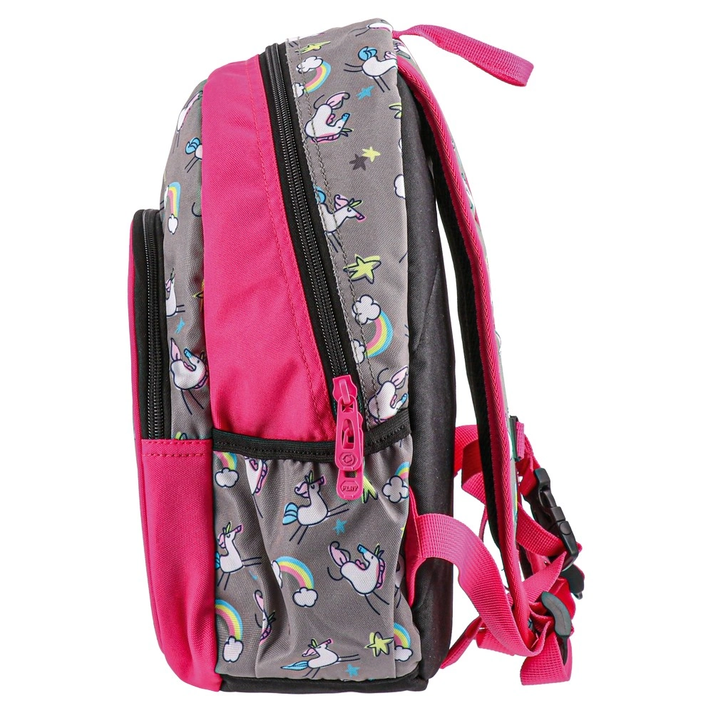 P2, backpack preschool, Rainbow unicorn: Trend-forward preschool bag with all-over unicorn, rainbow, star and cloud print on grey, contrasted by pink piping. Features a zip main compartment, front zip pocket and a fabric side pocket. Smooth zips and clean construction for daily use.