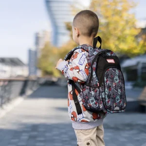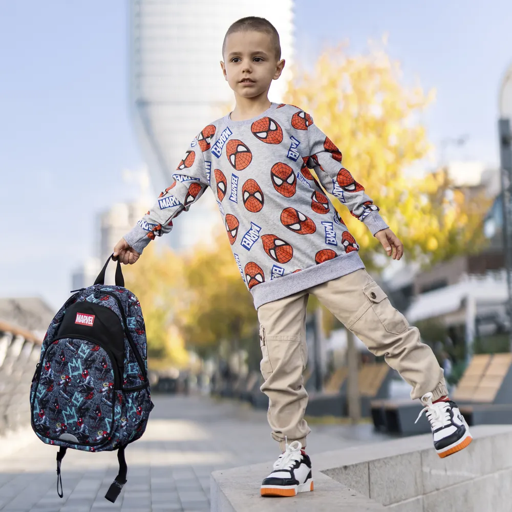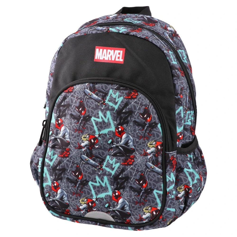 Designed for preschool, the P2 backpack showcases a bold Spider-Man graffiti print with prominent Marvel branding. Two zip compartments, a large front pocket with reflective detail, side slip pockets, and a top handle support daily use. Durable fabric and trend-led graphics drive sell-through.
