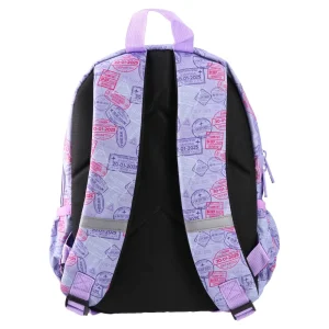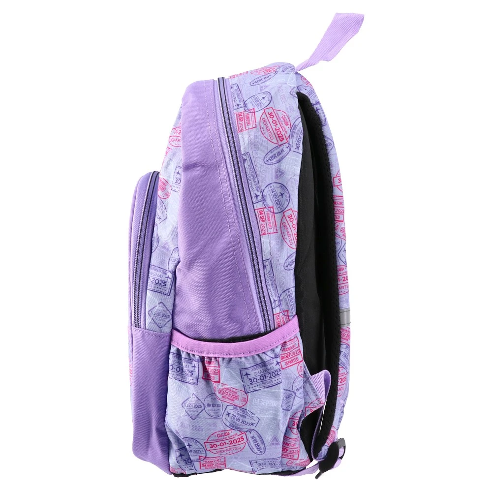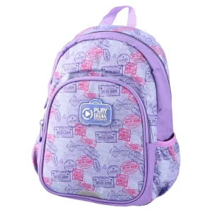 P2, backpack preschool, Travel The World: Trendy lilac backpack with an all-over travel-stamp print. Printed fabric, spacious main zip compartment, front zip pocket and side bottle pocket. Easy-grab top handle, edge piping and logo patch. Eye-catching, retail-ready for preschoolers.