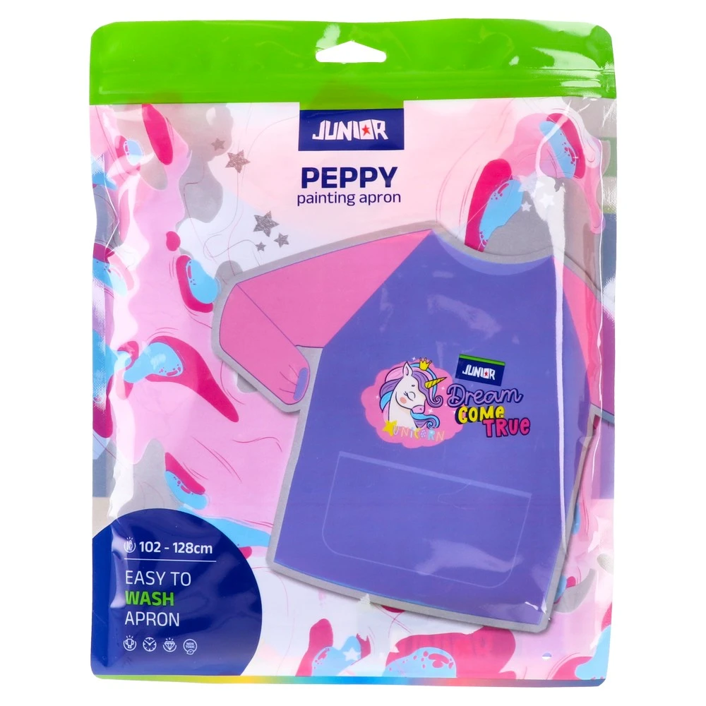 Trendy kids’ painting apron with unicorn graphic and “Dream Come True” print. Easy to wash; fits approx. 102-128 cm (4+). Features a front pocket for tools and ample coverage to protect clothing during art and craft sessions. Eye-catching, giftable, and ready for retail.