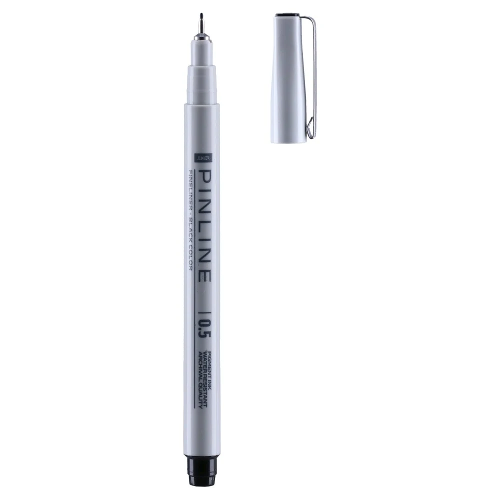 Pin line 0.5 mm black fineliner featuring a sleek silver barrel and a sturdy metal clip. The needlepoint, metal-clad tip provides crisp, consistent marks. Pigment ink is water-resistant and archival, as indicated on the pen. A modern, professional choice for drafting and precise notes.