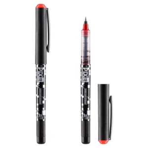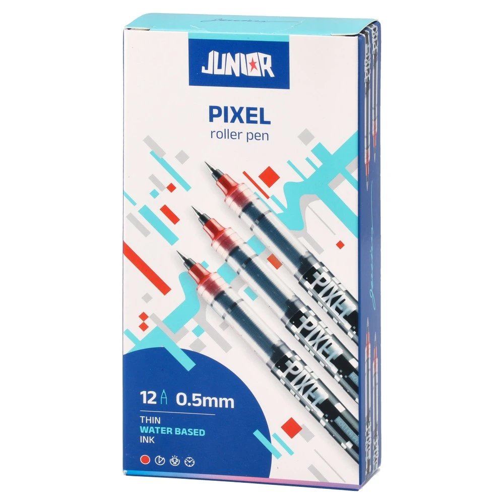 Pixel gel pen, red, 0.5 mm. Contemporary pixel-graphic barrel with transparent grip that reveals the ink feed. Fine tip writes clean, controlled lines. Matte black cap with sturdy metal clip. Lightweight body; reliable capped design suited to daily office use.