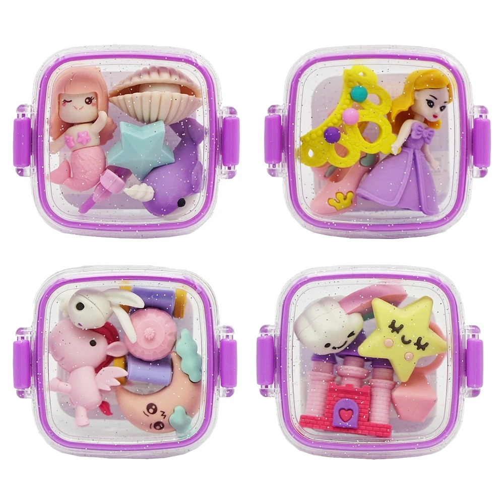 Pixi box, eraser, Princess: Assorted mini erasers in a princess/fantasy theme, packed in a square clear box with glitter effect and purple snap latches. Pastel colors and playful shapes like princess, mermaid, unicorn and stars. Attractive counter-sale item; storage supports repeat use.