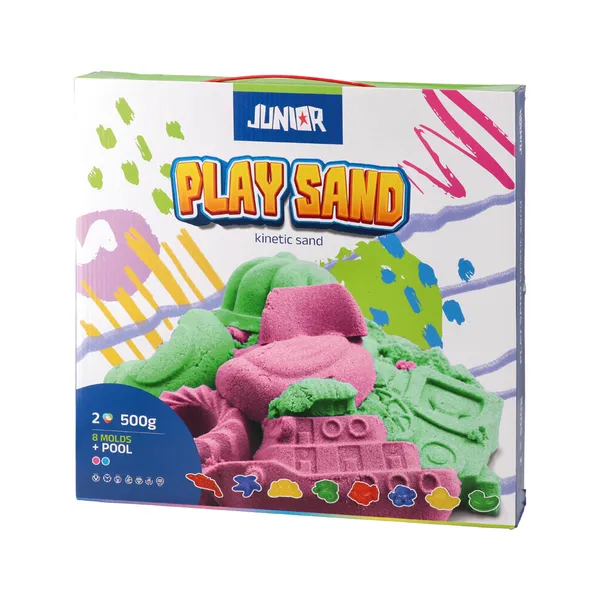 Play sand XL, kinetic sand with pool and molds, 1000g. Includes 2 x 500 g packs of moldable kinetic sand, 8 molds and a play pool. Vibrant colors and clean mold definition enhance creative builds and shelf appeal. Sturdy, colorful box is ideal for retail and e-commerce.