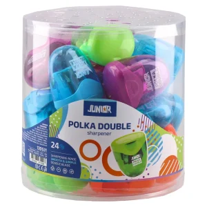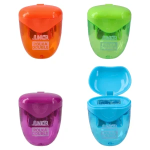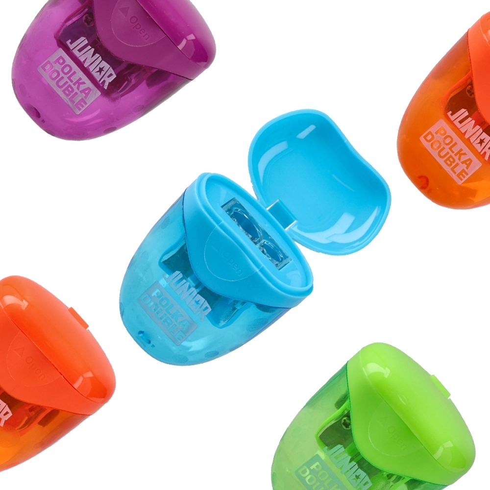 Polka Double sharpener with two pencil apertures. Trendy translucent body in assorted bright colors with integrated shavings container. Hinged flip lid keeps debris contained and reduces mess. Compact, durable plastic design suited for school, office, and high-volume resale.