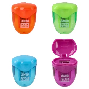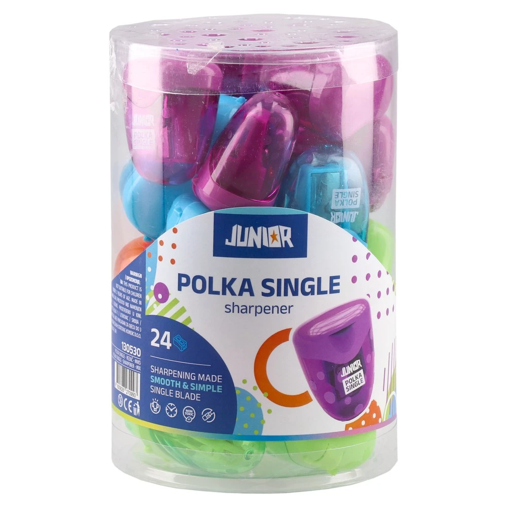 Polka Single, sharpener, mix: compact single-hole sharpener with a translucent, polka-textured body and integrated shavings container. Flip-top lid keeps desks clean and protects the blade. Durable plastic housing, ergonomic oval shape, and vivid assorted colors for strong shelf impact.