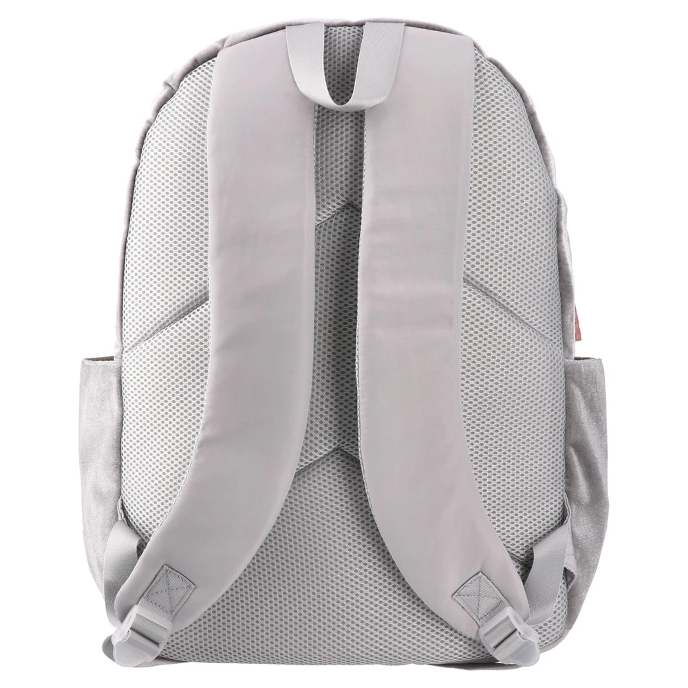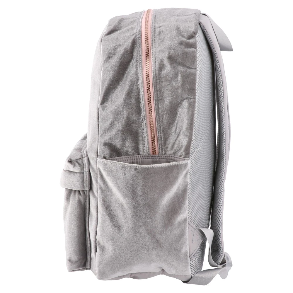 Trend-forward grey velvet backpack with a soft, tactile finish and pink accents. Features a roomy main compartment, front pocket, and twin side pockets. Clean lines, round badge detail, and quality construction make it eye-catching and retail-ready for modern assortments.