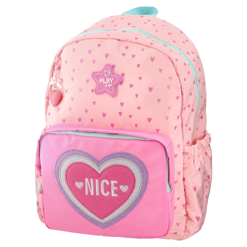 Pop fashion, backpack, Hearts. Trend-led pastel pink design with all-over heart print. Zippered main compartment, roomy front zip pocket with heart motif and NICE detail, plus elastic side pockets. Mint zipper accents, heart zipper charm, and top carry handle. Retail-ready appeal.