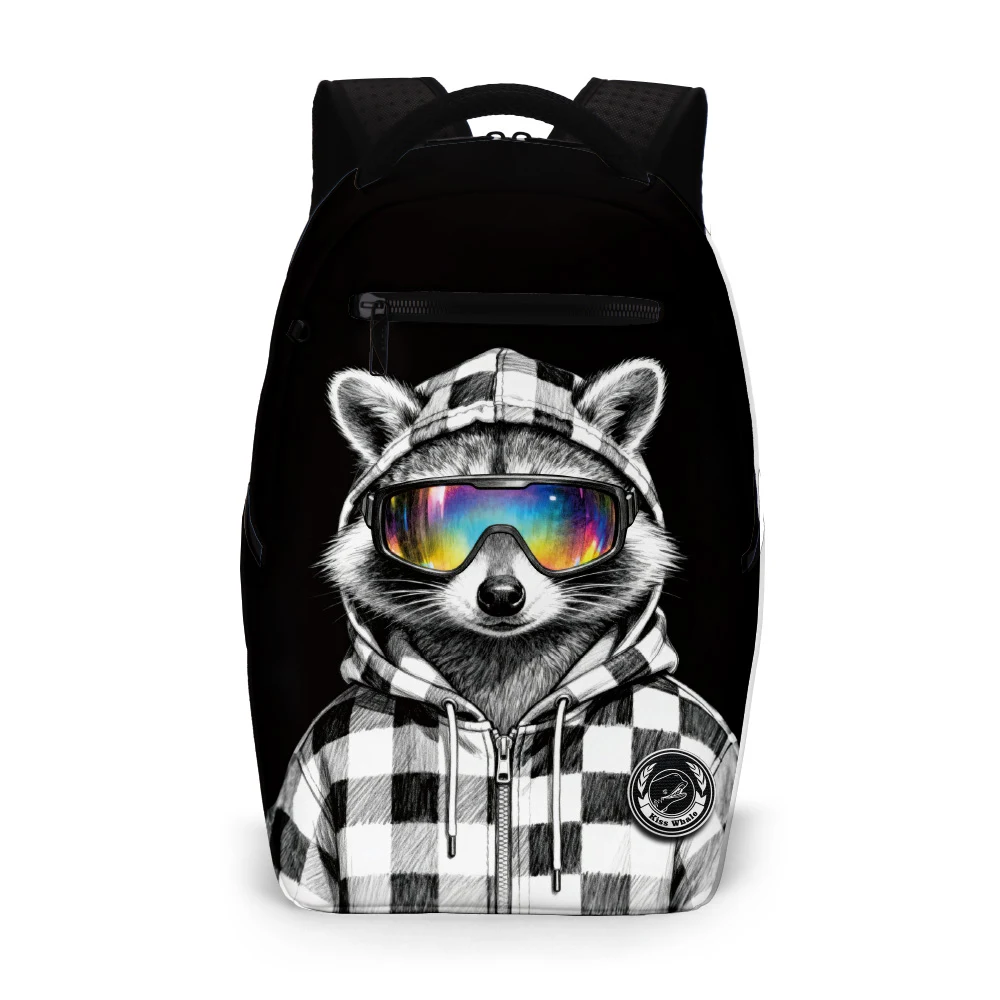 Pop Street backpack by Solvar showcases a black base with a bold raccoon-in-hoodie graphic and iridescent visor. Features a top carry handle, shoulder straps, and a front zip pocket for quick access. Clean silhouette and high-contrast artwork boost retail impact and sell-through.