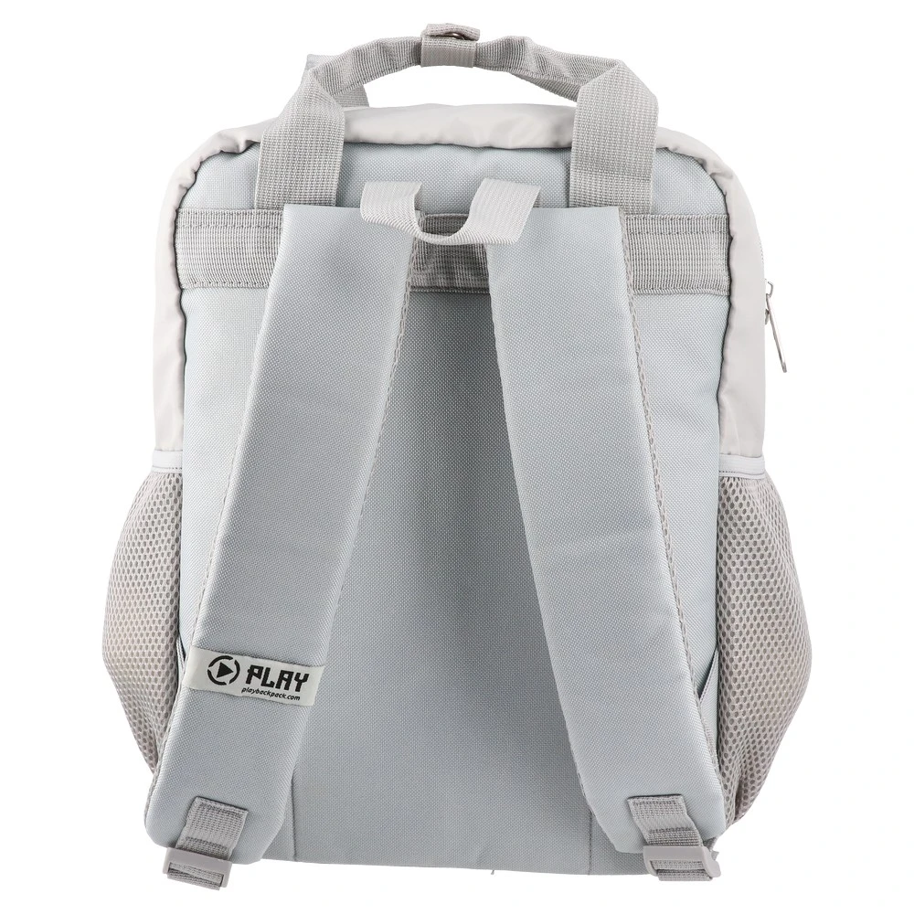 Pop trend, backpack, Shiny dog. Trend-forward backpack with iridescent sequin front and a plush dog-face zip pocket for tactile shelf appeal. Light grey fabric body, mesh side pockets, zip main compartment, top carry handle and reinforced strap stitching. Strong back-to-school seller.